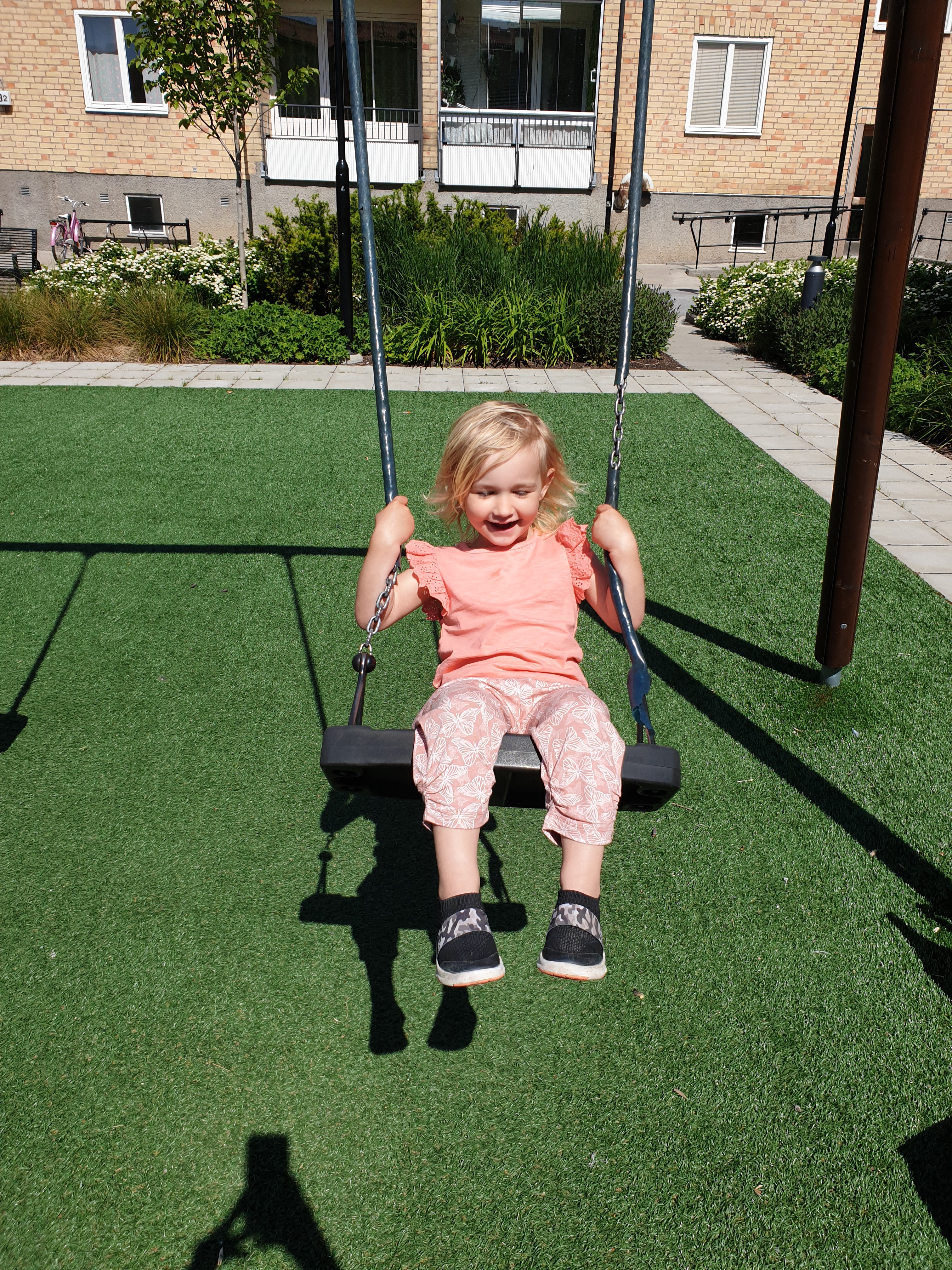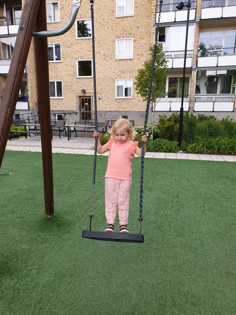 Ungsudden älskar att gunga! Och hon kan redan få fart själv, inte en 3 år gammal!