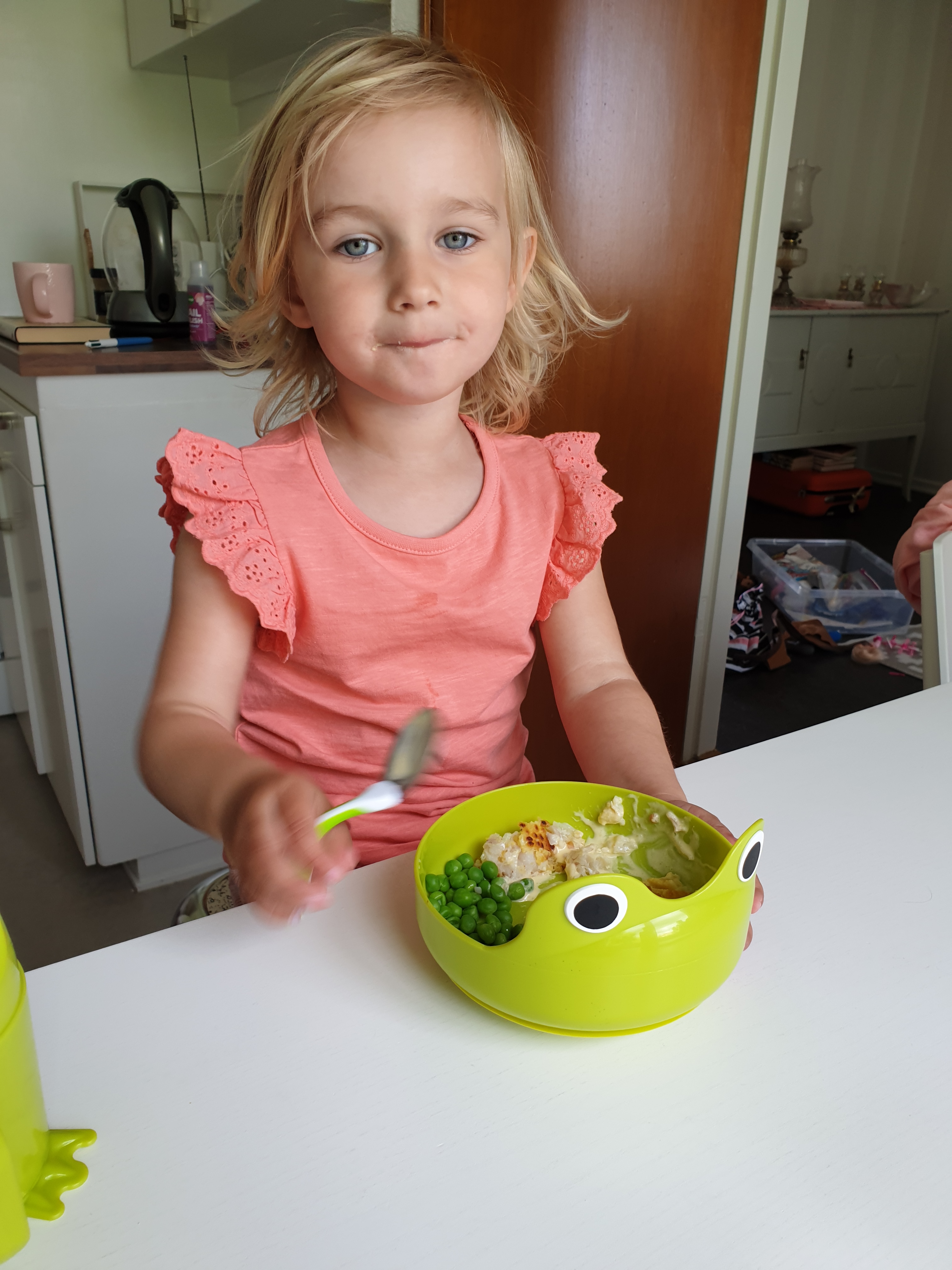 Lilla gokorv!! Hon pratar så kul, de flesta konsonanter byts ut till H i början av orden. Jag sa att hon är mommos lilla loppa. – Jag mammas hilla hoppa, svarar hon då.