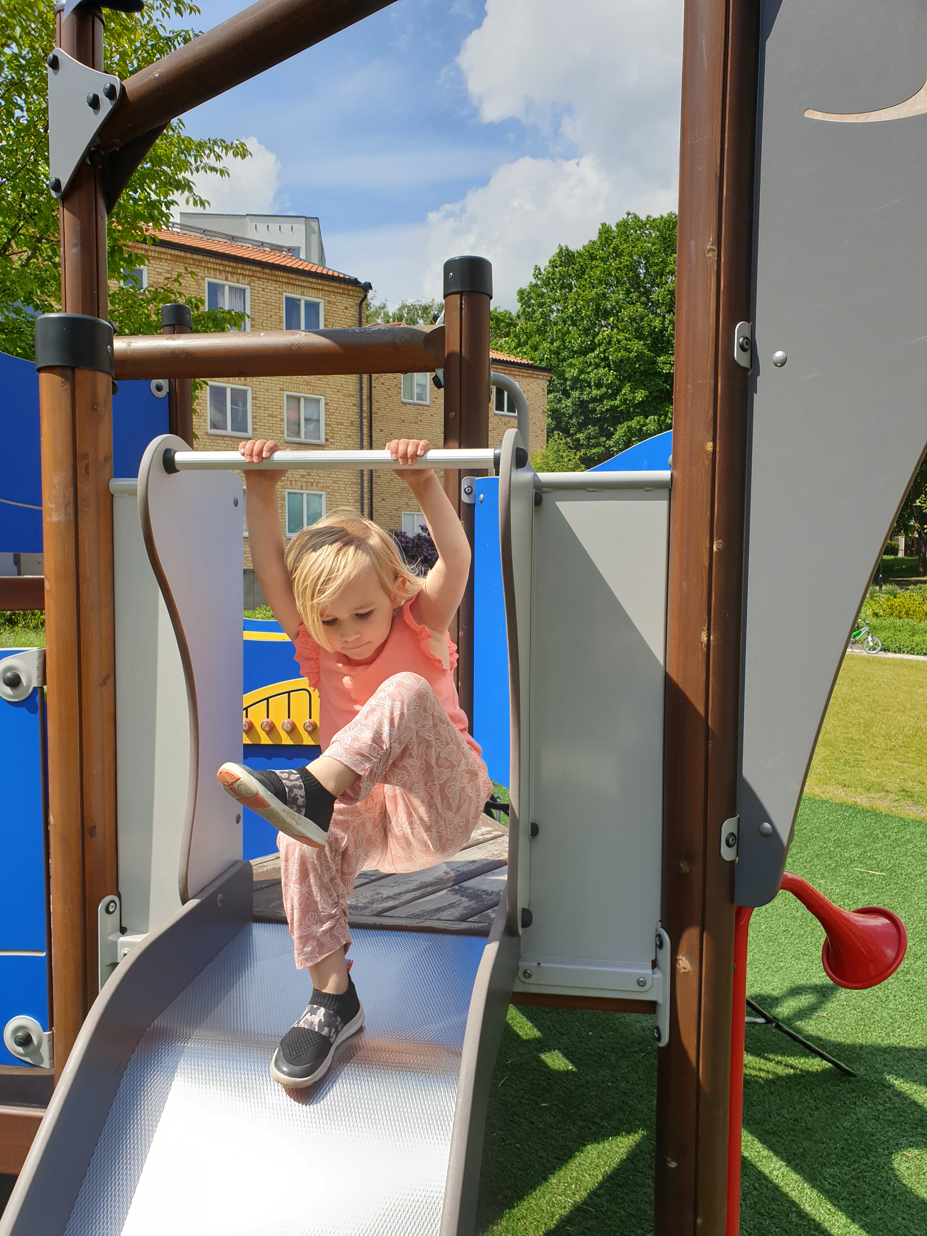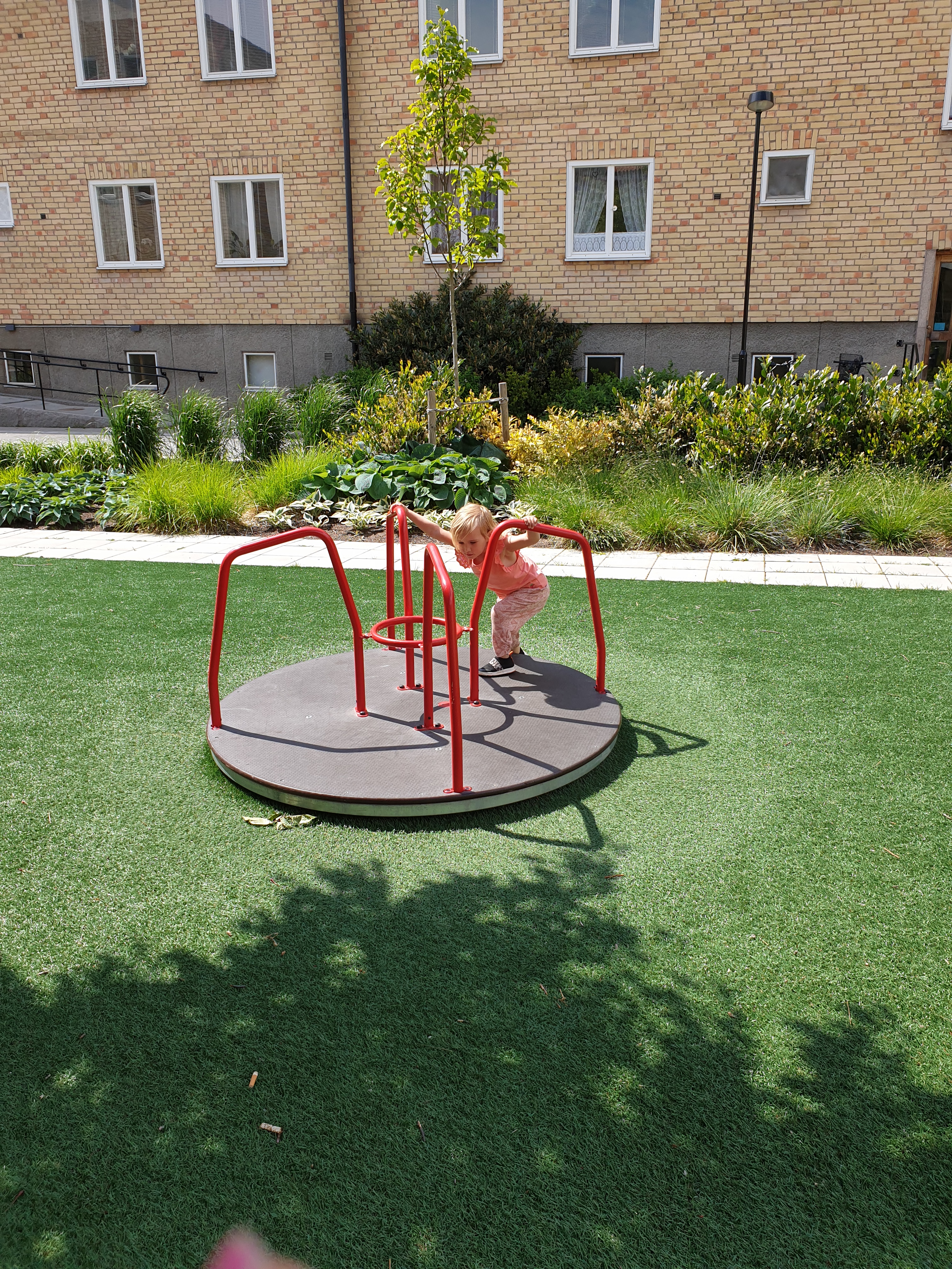 Efter maten gick vi ut igen, och på gården bredvid finns en rutschkana och en karusell.