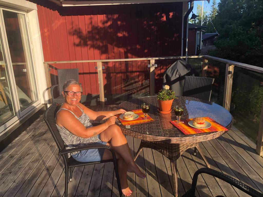 Nästanguddottern och jag åt haloumiburgare på altanen igår.