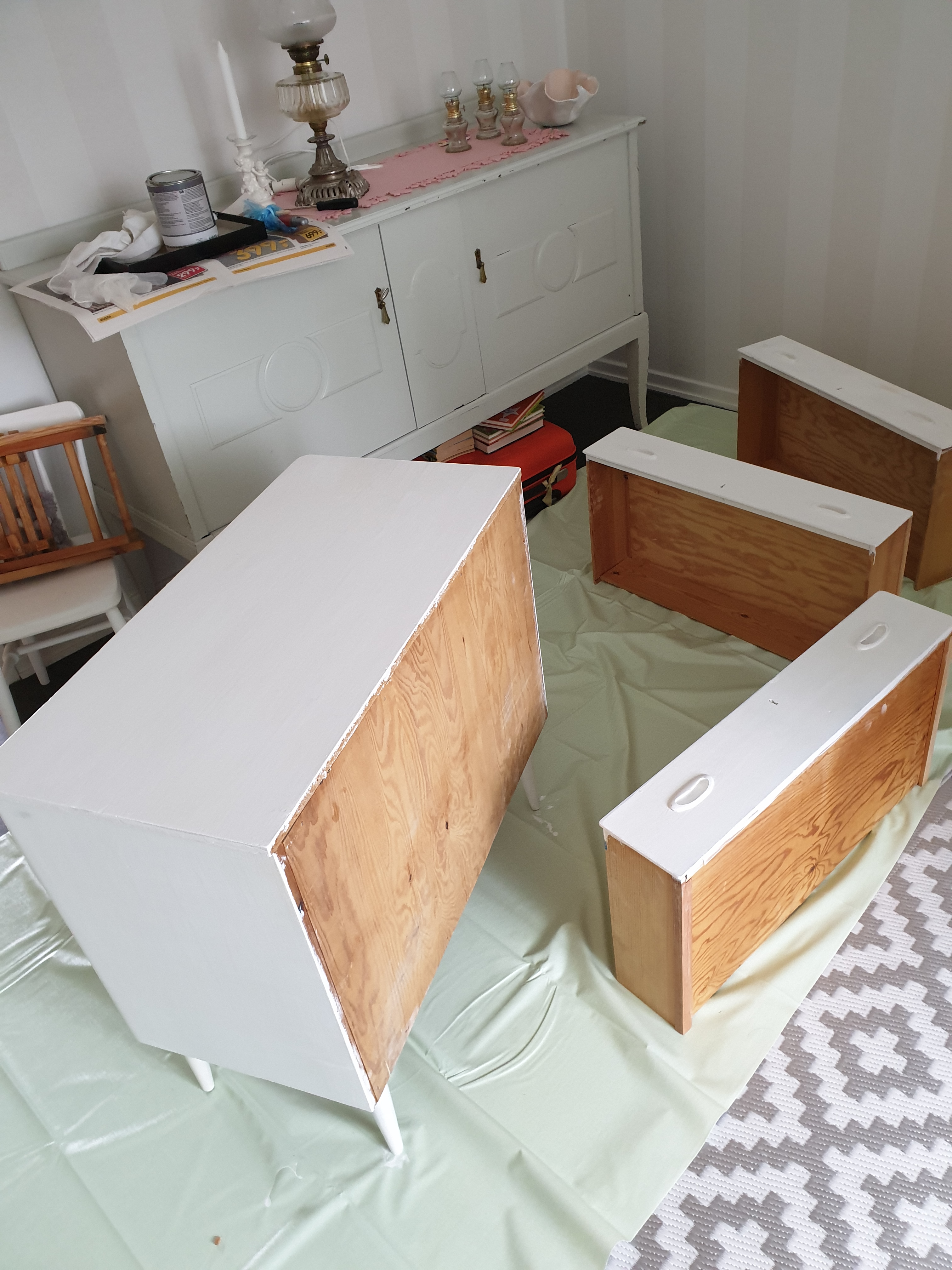Det vill jag helst bara ska vara klart, så jag kan lägga i sockor, sjalar och annat och få fint i hallen. Gillar att plocka in i lådor, sortera och organisera! Men då måste jag så klart måla den först…