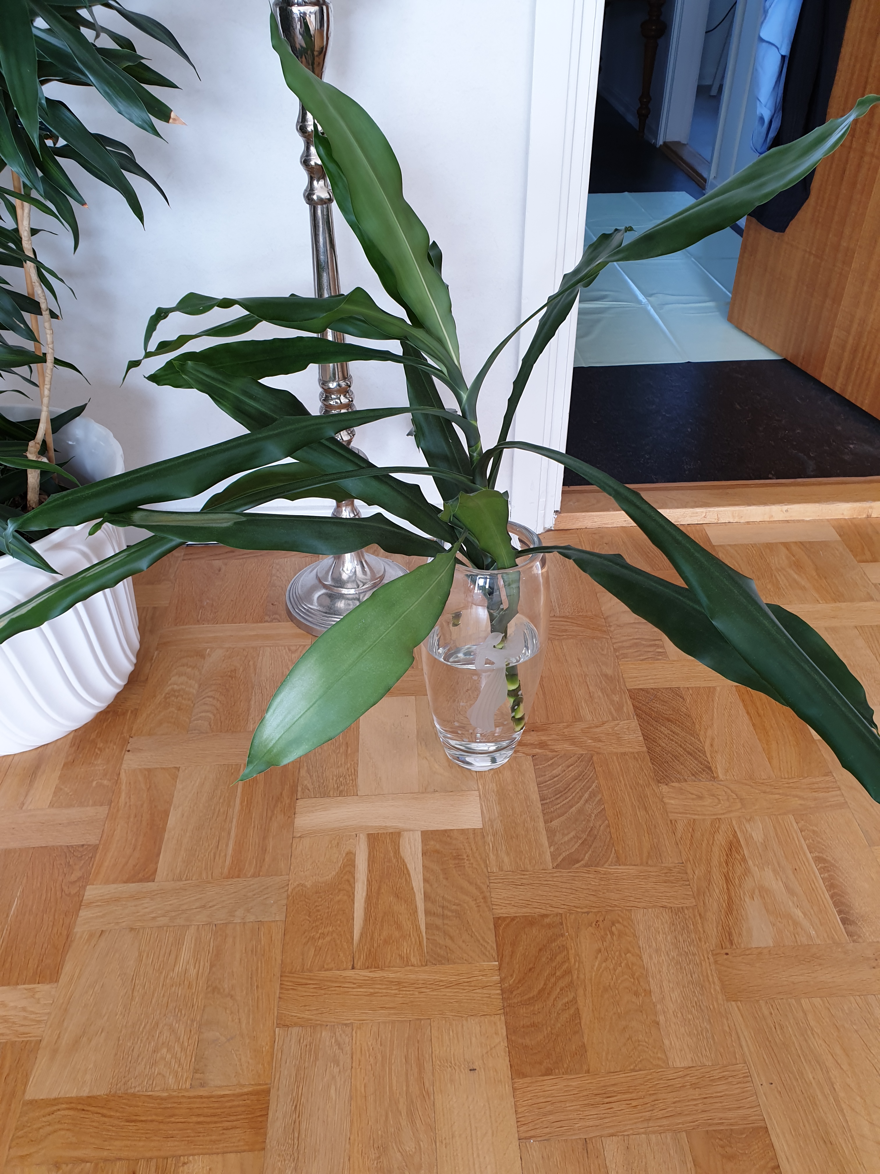 Igår fick jag för mig att flytta på den stora dracenan och ha den i sovrummet i stället. Släpade dit den och insåg att den var för buskig, tog för stor plats. Så fram med sekatören igen!