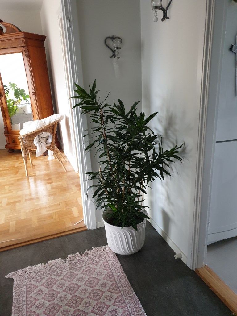 Jag ställde en av växterna i hallen för att kunna ha extrabordet i vardagsrummet när vi var många i helgen. Och jag låter den stå kvar där, det är ganska ljust i det hörnet, så den kan nog trivas där.