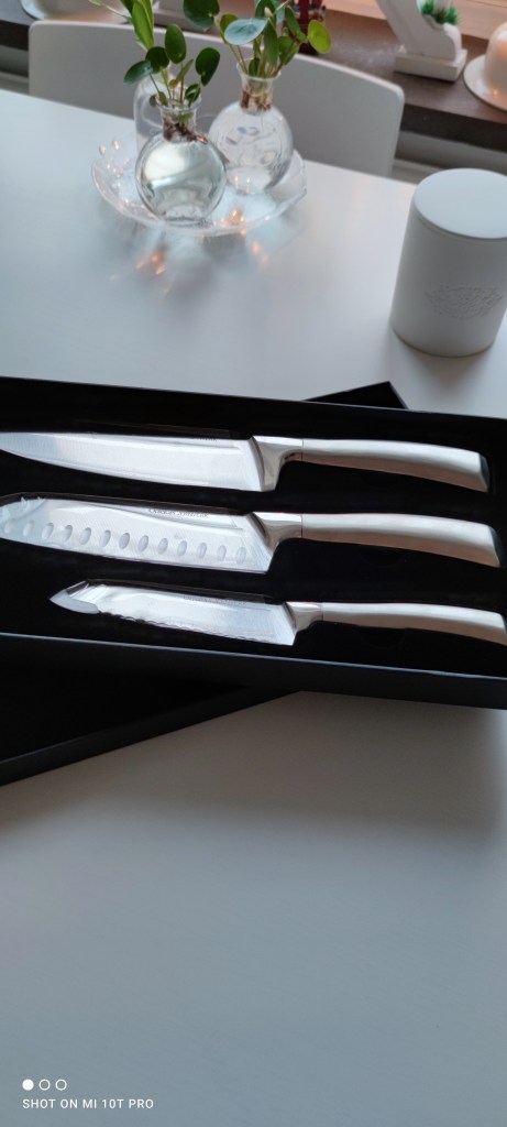 3 superbra knivar! Jättebra, för de jag har, alla utom 1 brödkniv, har jag ärvt av mamma… Lite gamla och aldrig slipade….. De här ska man kunna ha länge och man kan så klart slipa dem när de behövs. Nettis frågade om jag har en slip och nä, det har jag ju inte. Hon mumlade då nåt som födelsedag, hehe!!