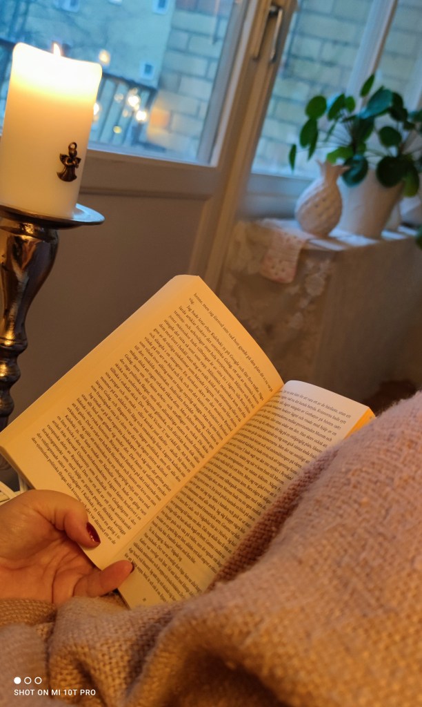 Nu sitter jag och läser. Med en filt över benen och ljuset tänt.