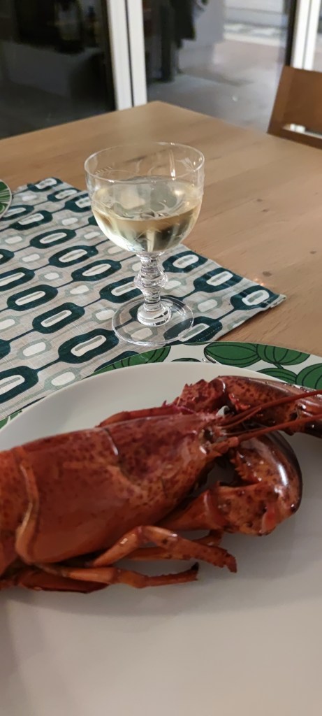 När vi kom fram och hade packat upp tog vi varsin glas vin, och sen åt vi hummer.