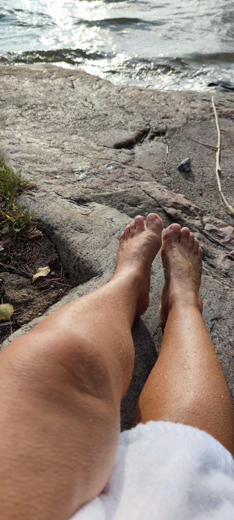Nybadade ben i badrock! Det var 13° i vattnet, så jag låg inte direkt i och plaskade. Men ett dopp blev det!