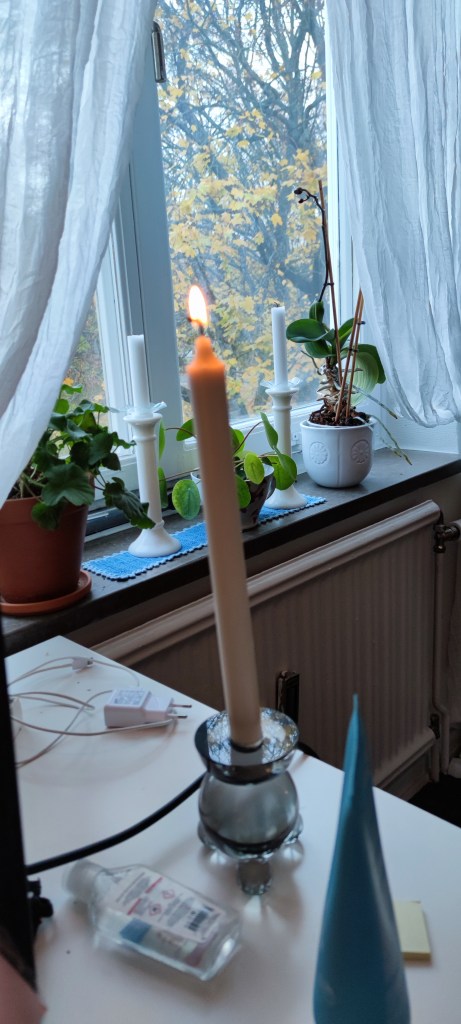 Igår var det så mörkt och trist på hemmakontoret. Så ett ljus myste till det hela lite.