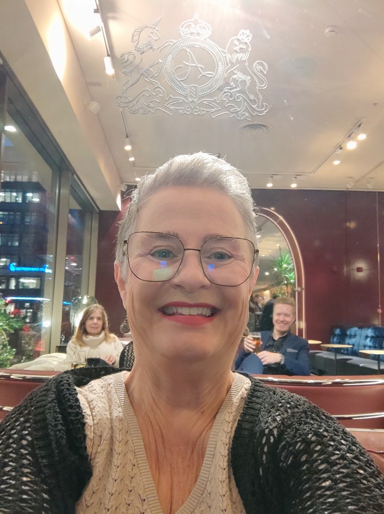 Bakom mig var en spegelvägg, så jag tog en selfie så att Maggis och Bossen kom med. Vi var på Scandic Stureplan och satt i sköna soffor och hade så kul! Maggis och jag satte oss, och Bossen kom med varsitt glas vin/öl och nötter till oss. Han fick gå 2 gånger, medan vi satt bekvämt och blev serverade. Hehe!!