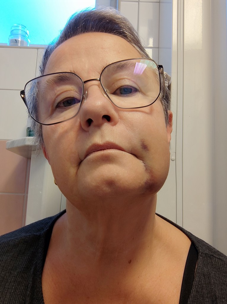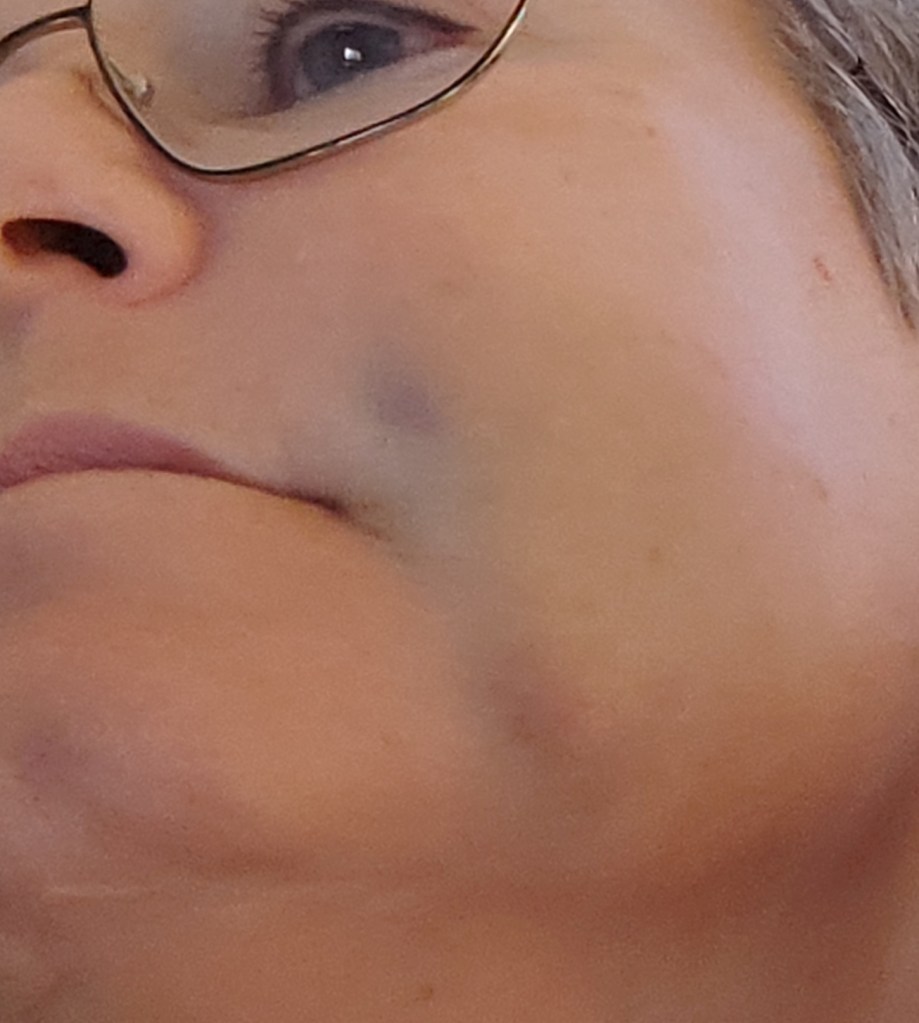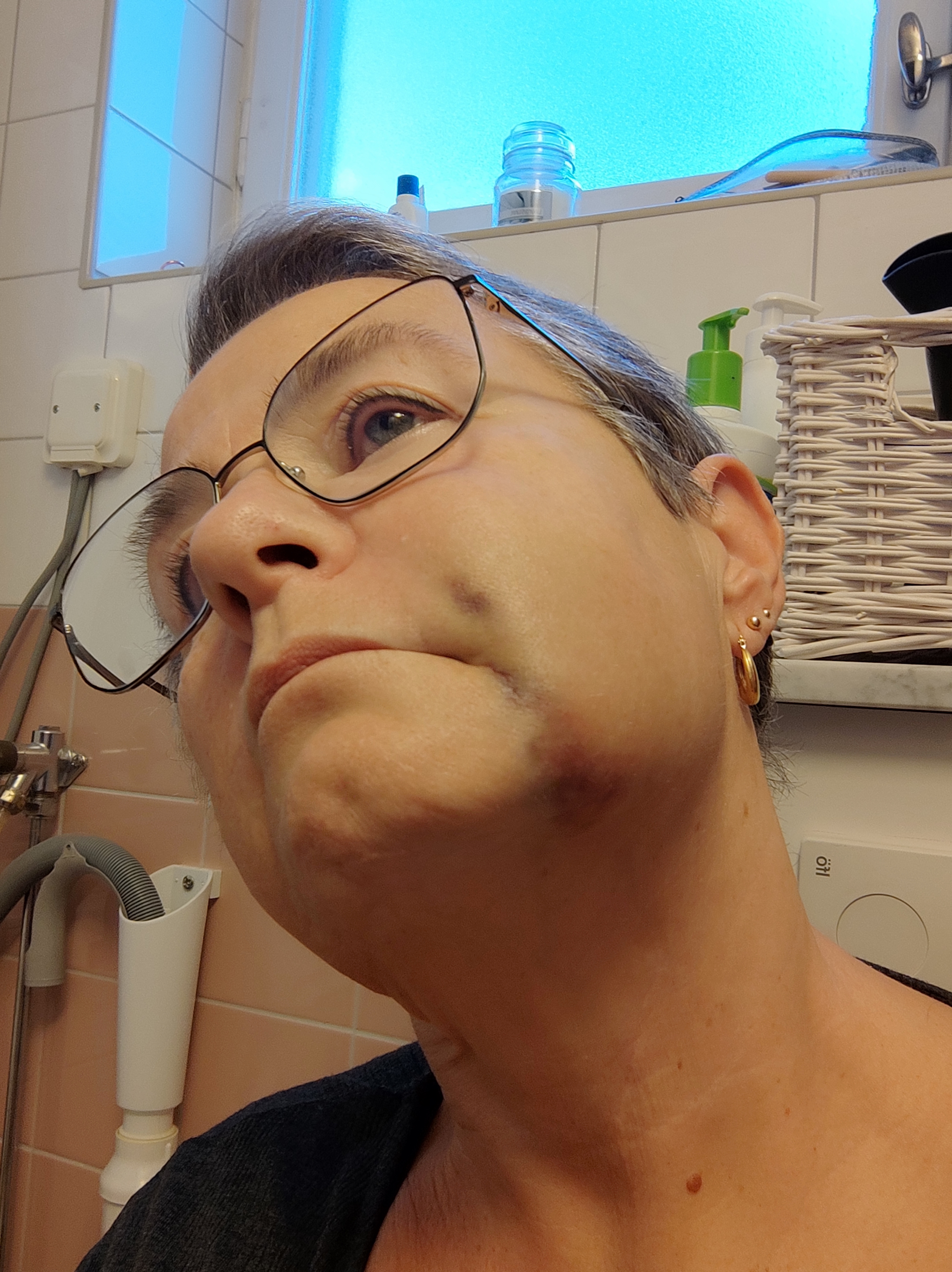 Inte lika svullet i alla fall. Fortfarande tar glasögat i kinden på den sidan, men det är mindre svullet än igår.