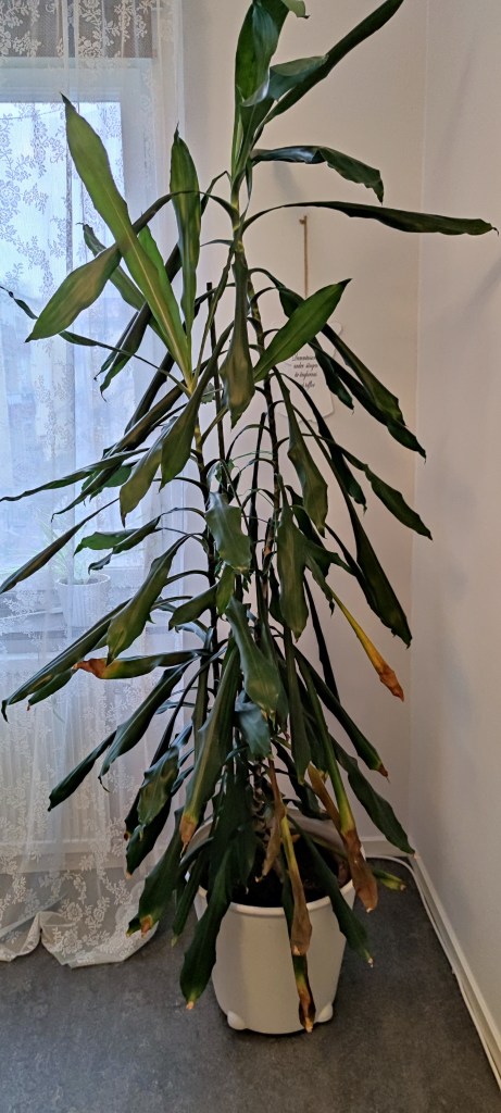 Min dracena som jag kapade och satte ner i jorden utan att först få rötter i en vas. Den är däremot deppig. Kanske har den ångest oxå, men definitivt deppig.