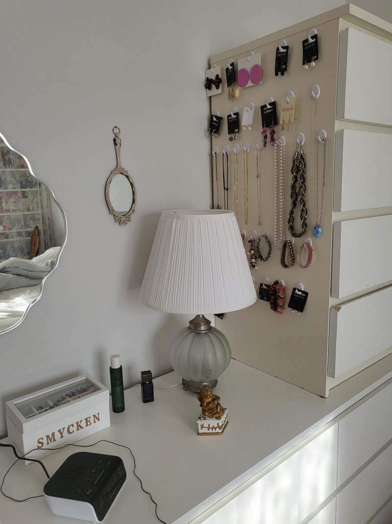 Och så satte jag upp krokar på byrån så att alla smycken hänger fint och lättåtkomliga.