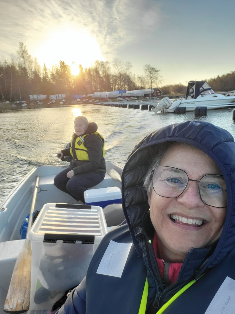 När vi kom fram så stannade vi längs med bryggan för att lasta av innan vi skulle dra upp båten på land. Och jag höll i bryggan med en hand och skulle lyfta upp min väska på bryggan. Har ni sett Gösta Ekman i filmen Atr angöra en brygga?? Vi, eller det var enbart jag, höll på att göra del 2 av den…. Jag har aldrig varit så lång som när det blir ett större och större glapp mellan båt och brygga! Till slut lyckas jag, fråga inte hur, få både alla kroppsdelar och väska tillbaka på båten! Anita var först i chock, sen full av beundran att jag inte plurrade!! Själv höll jag på att skratta mig fördärvad! Jag önskade bara att jag kunnat se mig själv, det måste ha sett så kul ut!