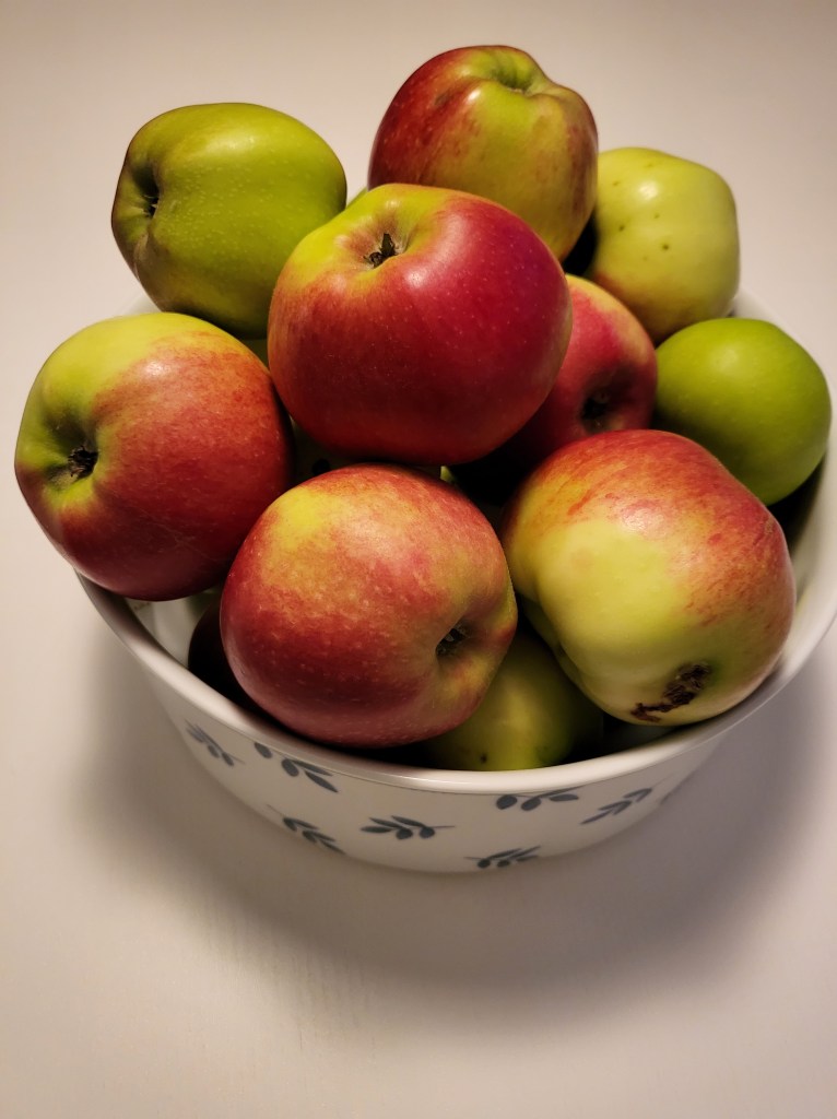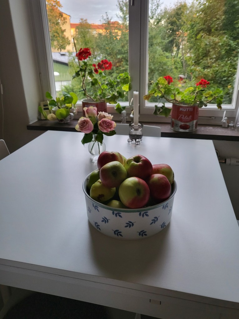 Maria och jag var och tränade igår. Hej och hå!! Svetten rann. Vi är så duktiga! Jag körde henne hem, och fick syn på deras äppelträd som var fullt av äpplen. Maria frågade om jag ville plocka lite, så jag gick ur bilen och fick en påse.