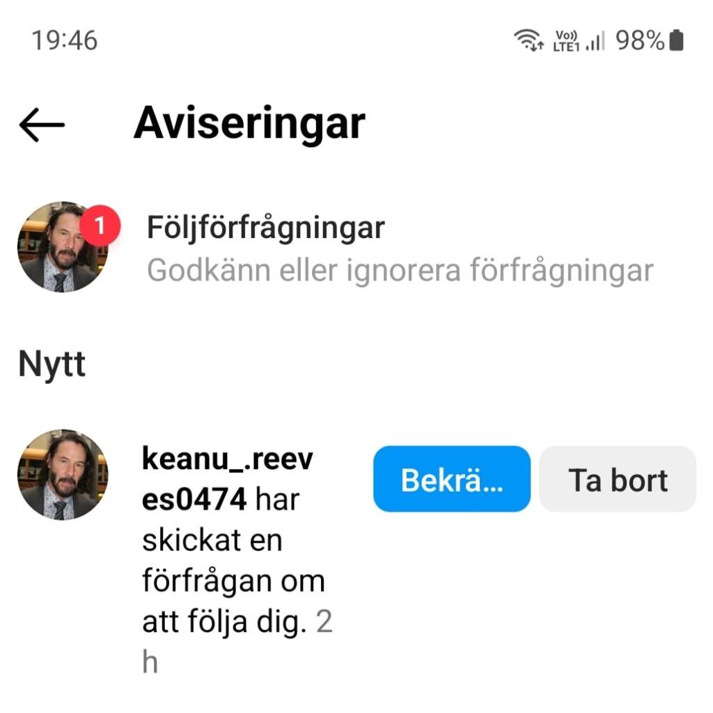 Ååå, igår fick jag en vänförfrågan på Instagram. Från Keanu Reeves! Tänk, han vill följa mig. Vi kommer nog bli vänner, bästisar!