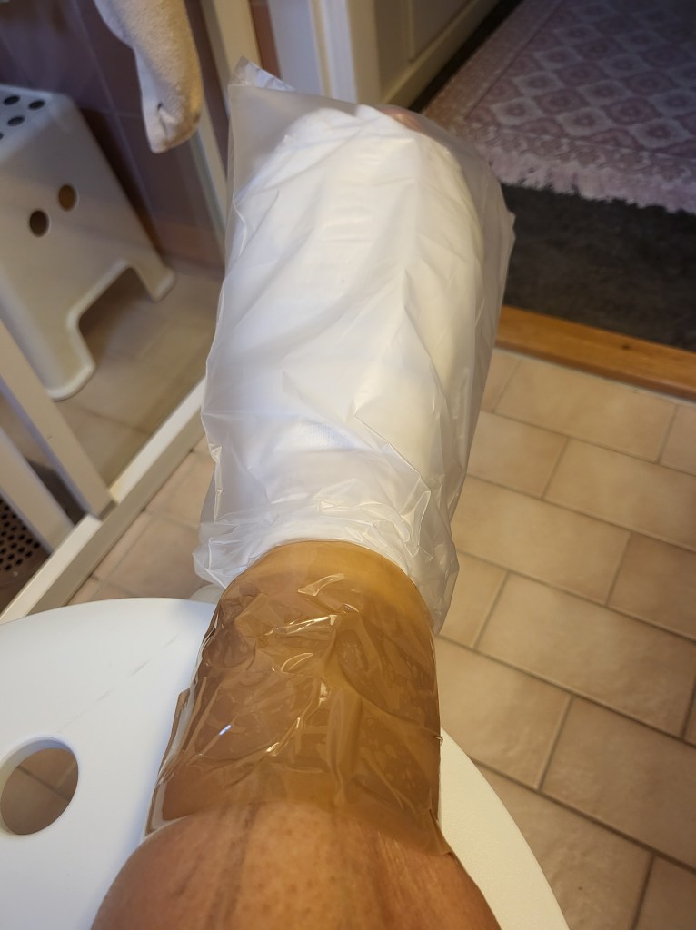 Inför att jag skulle operera den högra foten så köpte jag några speciella ”påsar” på apoteket. Men dels var de så himla långa, och de kostade en del. Jag insåg då att en vanlig plastpåse och tejp funkar lika bra! Fast igår drog jag runt tejpen lite hårt, nästan så det stasade. Men det funkade bra, jag blev ren och foten var torr.