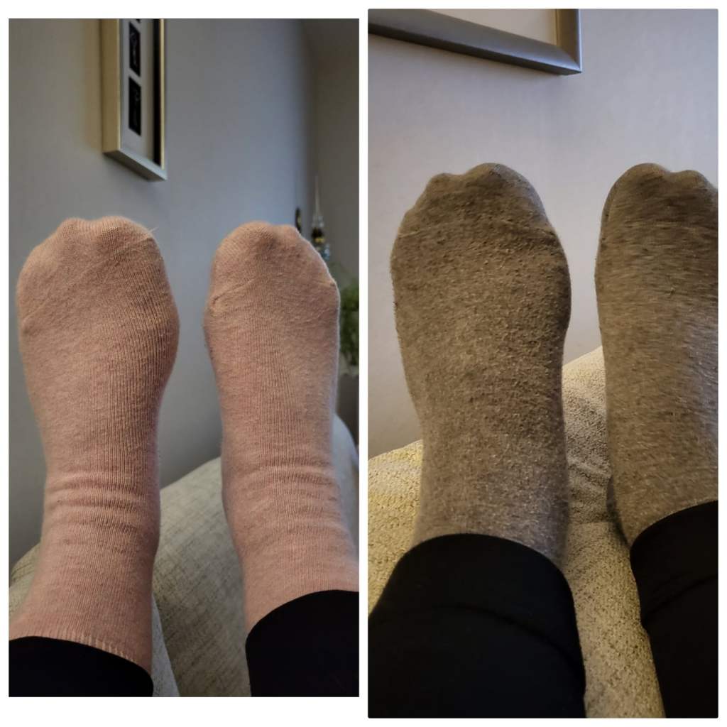 Med de rosa strumporna var när jag just tagit av bandaget och den andra igår. Det är en viss skillnad, även om det så klart fortfarande är svullet. Det känns onekligen som att det går åt rätt håll!