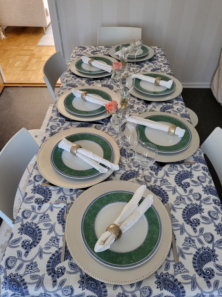 Dukade med finservisen och tygservetter och gjorde fint (om jag fÄr sÀga det sjÀlv). Sen kom Sara och vi förberedde allt vi handlade i torsdags och fyllde mitt kylskÄp och bÀnk med.