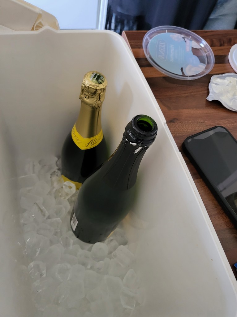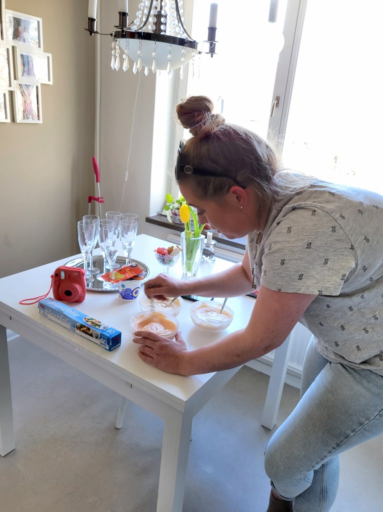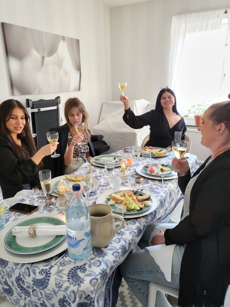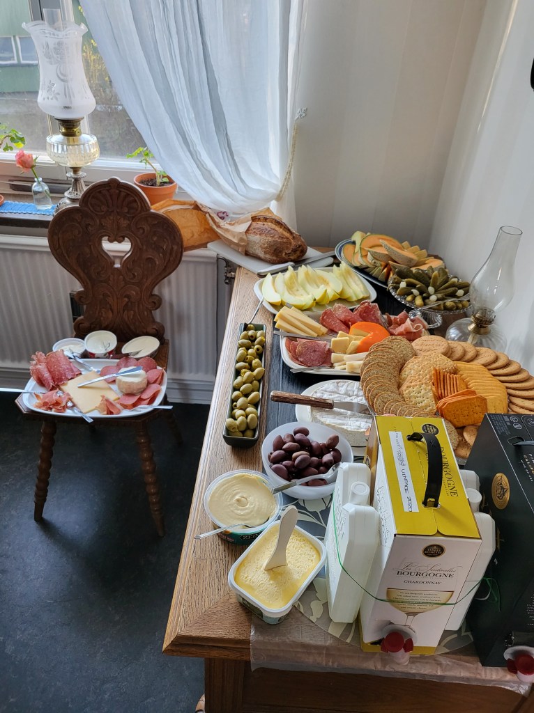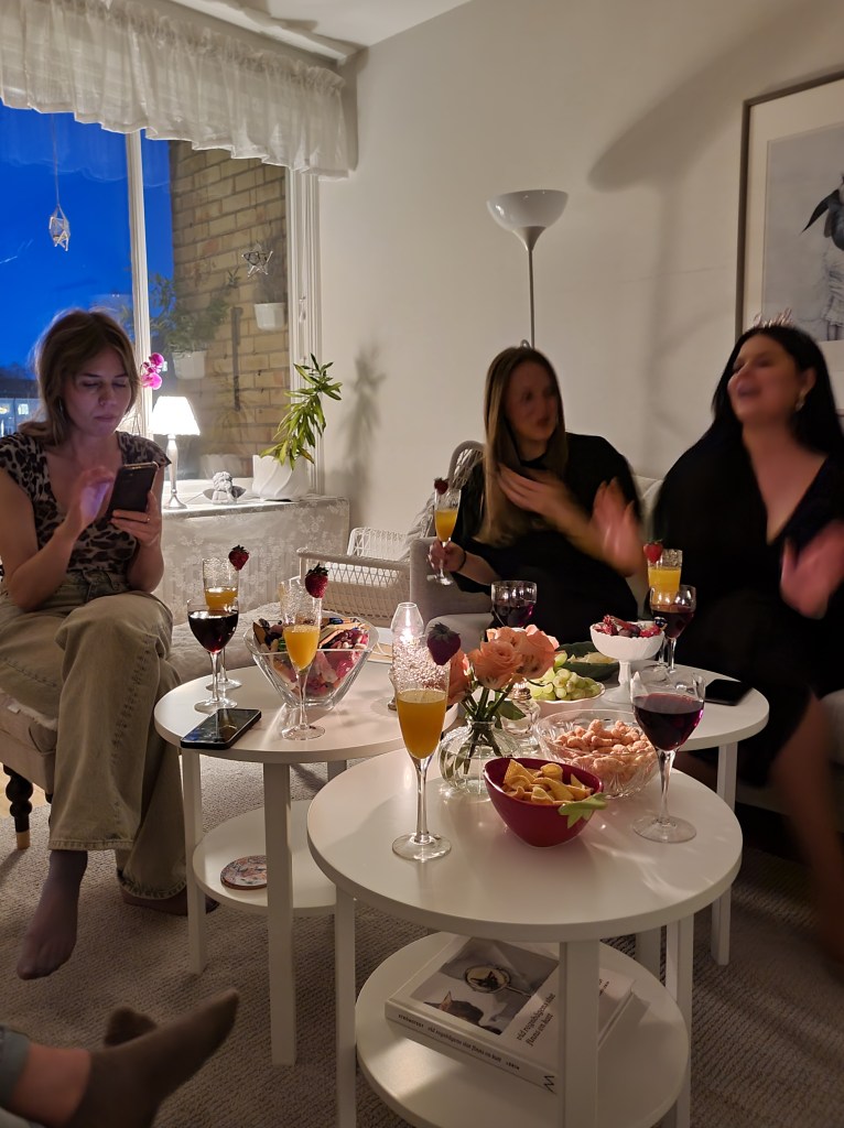 NÀr alla var nöjda sÄ flyttade vi in i rummet, dÀr chips och snacks var framdukat. Vi fortsatte babbla, drick vin och bubbel och ha trevligt.
