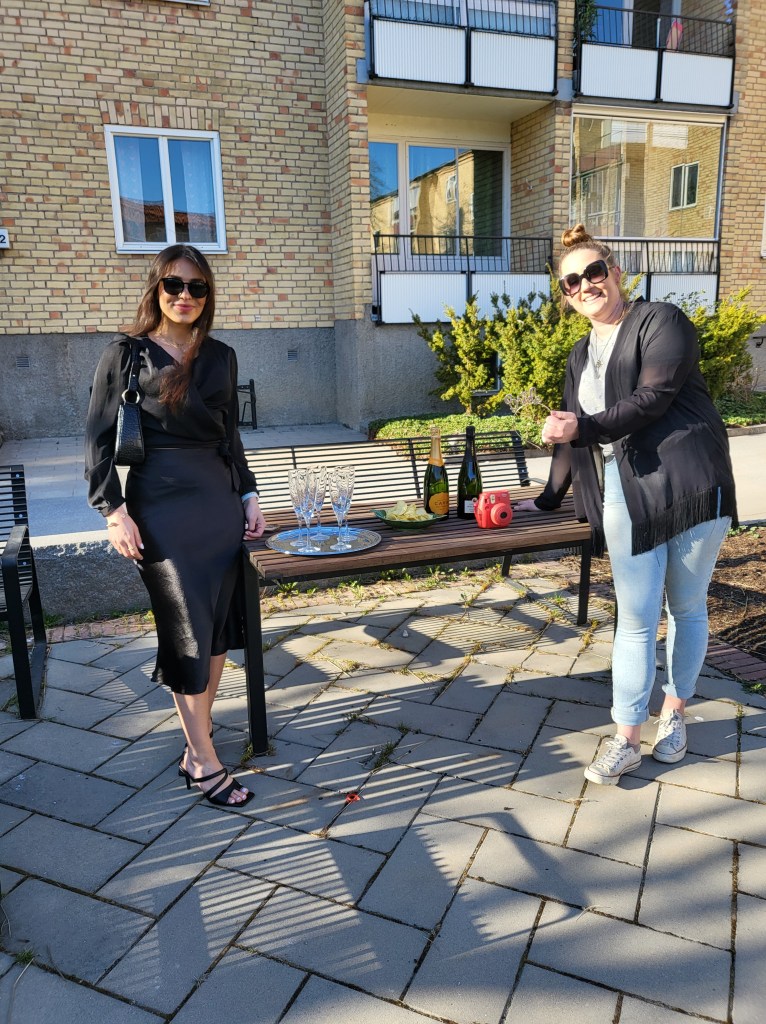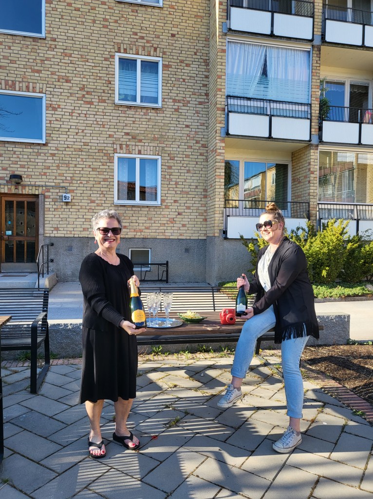 NÀr hon och hennes kompis Frida, som varit med henne till salongen, kom sÄ blev det kramkalas och bubbel ute en stund innan vi knatade upp till mig.
