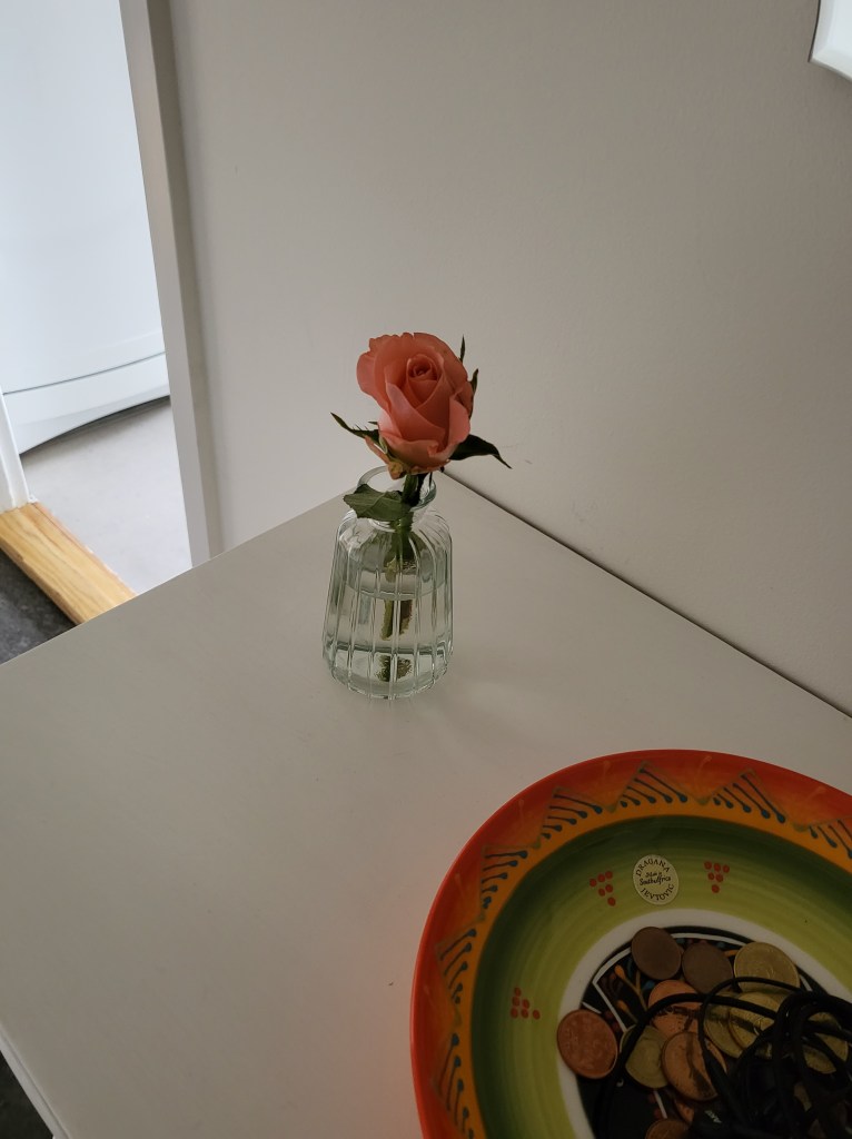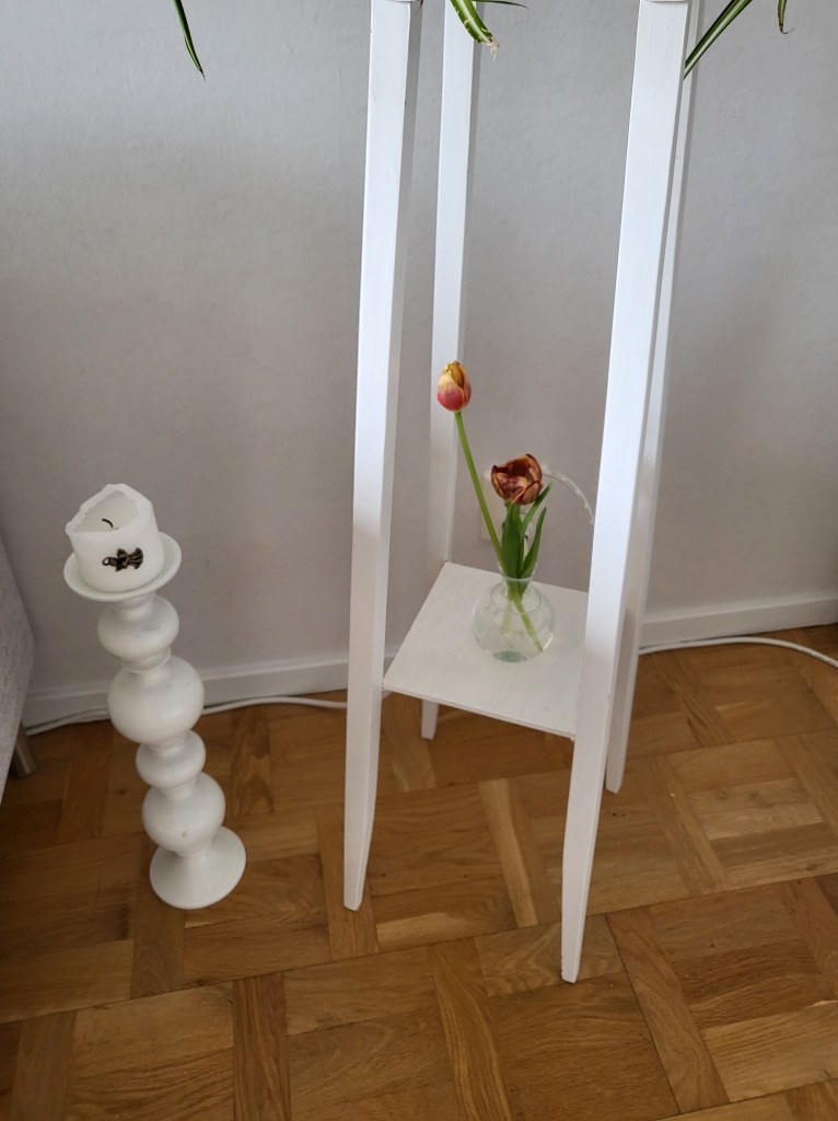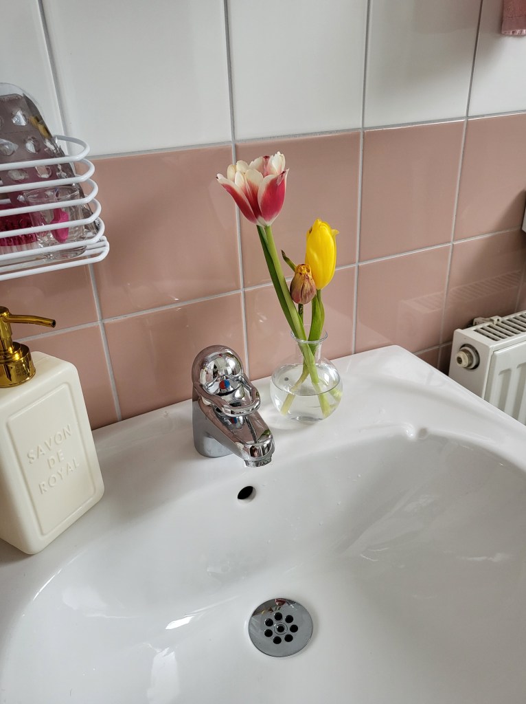 I fredags pÄ vÀgen hem frÄn jobbet köpte jag 1 bukett tulpaner och 1 bukett rosor. Hemma sÄ snittade jag dem ganska kort och satte i smÄvaser runt om hemma.