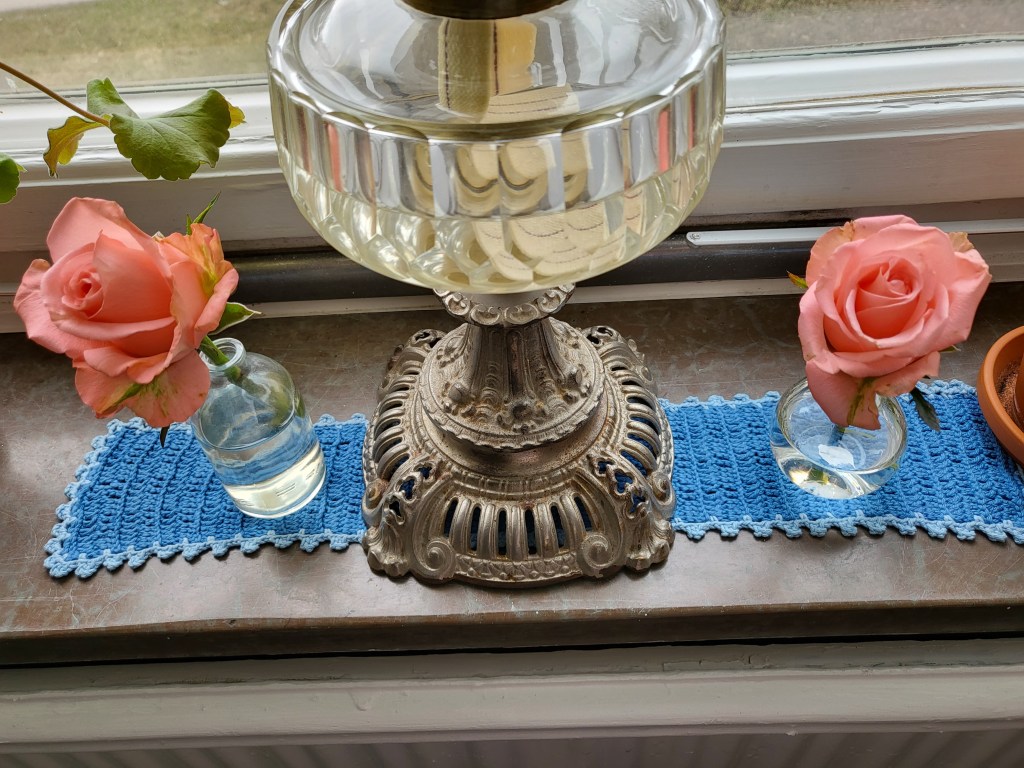 De virkade dukarna i fönstren har min gammelmormor virkat. Så värdefullt att ha kvar.