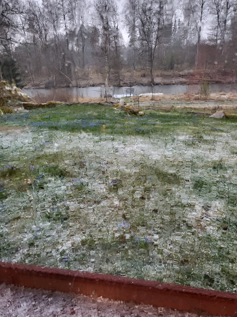 Först spöregnade det, sen haglade det. Det haglade så det smattrade på vedspisen! Och haglet låg kvar på marken länge, innan det till slut smälte. Hua!!!