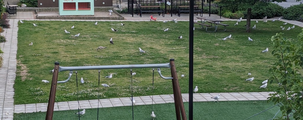 Hela gräsmattan var full av måsar! Och efter en stund lyfte alla samtidigt och flög iväg. Mötet var tydligen avklarat.
