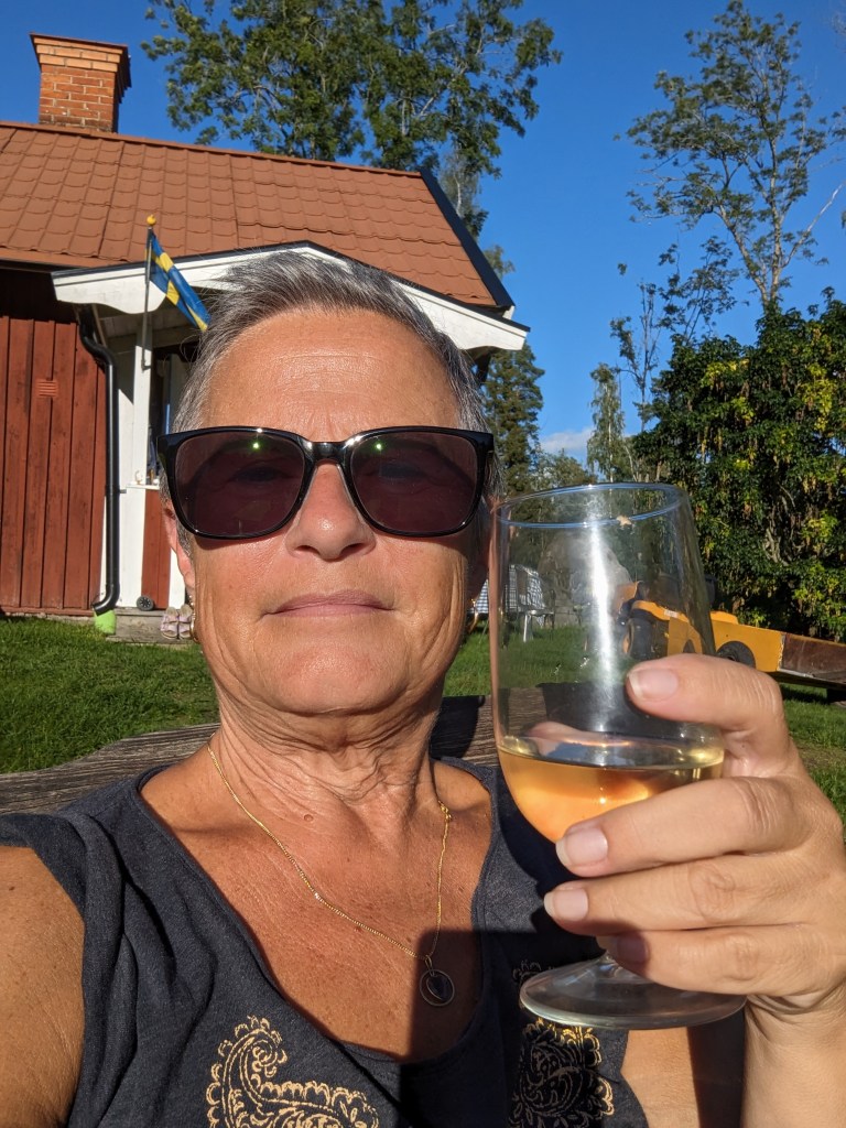 Sen knatade vi hem till vårt, och under över alla under;solen sken! Så M och jag satte oss ute med varsitt glas vin.