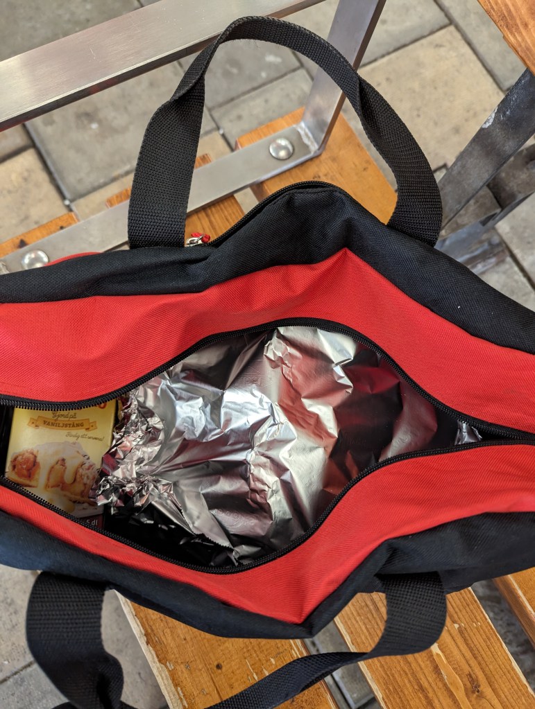 Funderade på hur jag skulle forsla den, och hittade en bag med hård botten. Perfekt! Så den stod stadigt hela vägen!