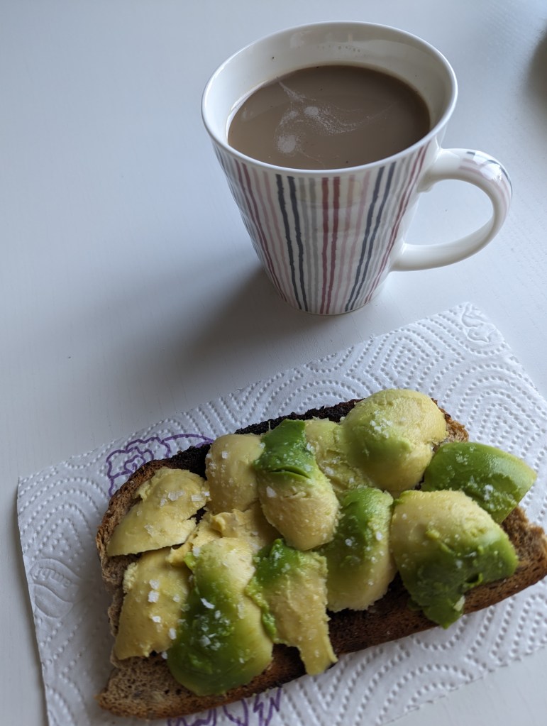 Nu sitter jag vid frukostbordet.