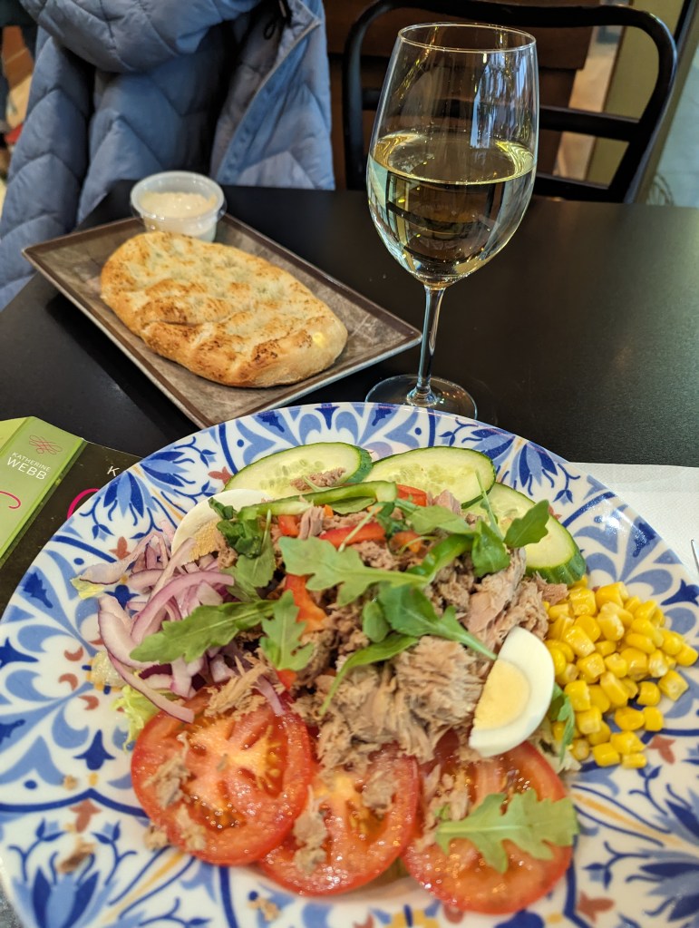 Jag bestämde mig för att äta innan jag knatade hem, så jag gick in på pizzerian och beställde en sallad. Och ett glas vin.