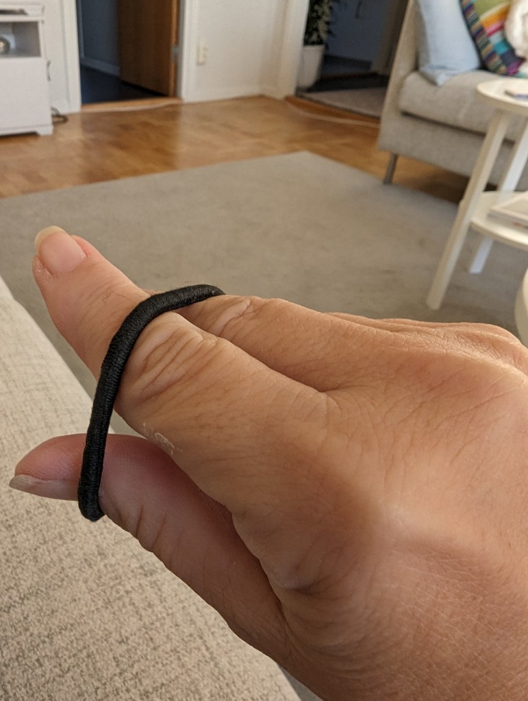 Jag ska försöka spänna ut fingrarna med en snodd som motstånd. Det går inte. Nån millimeter bara. Men jag antar att det är för att musklerna inte ska förtvina, liksom. Utan snodden så gör jag samma, och det går ju inte särkilt mycket bättre. Och så tar jag den andra handen och stretchar ut högerhandens fingrar.