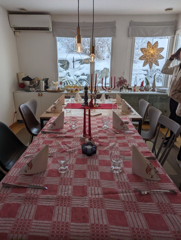 Vi drack glögg medan vi hjälptes åt med att plocka fram, duka, värma mat och tänd ljus. Och sen åt vi massor av god mat! Mmmm! Och drack julmust. Så himla gott, och jättetrevligt! Vi satt länge och umgicks och babblade. Och efter maten var det kaffe och saffransbullar och en kladdkaka med vit choklad och saffran. Och den var supersmarrig!