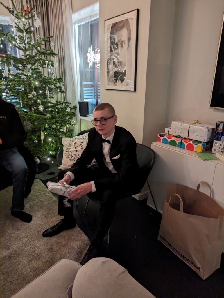 Han var så fin!! I ny kostym med fluga. Plötsligt en ung man. Och så himla artig, tackade och blev glad för allt han fick. Goa!!