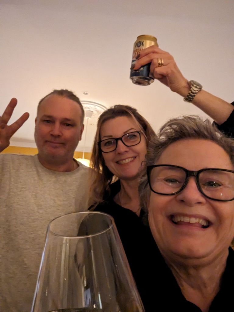 Vi satt ett tag och babblade och drack lite vin innan Micke lagade middag. Så mysigt, och i vanlig ordning många skratt!