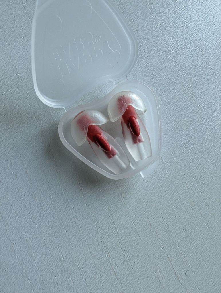 När jag skulle sova så smattrade regnet mot fönsterblecket i sovrummet. Så jag rotade fram öronproppar. Hittade ett par jag inte testat än.