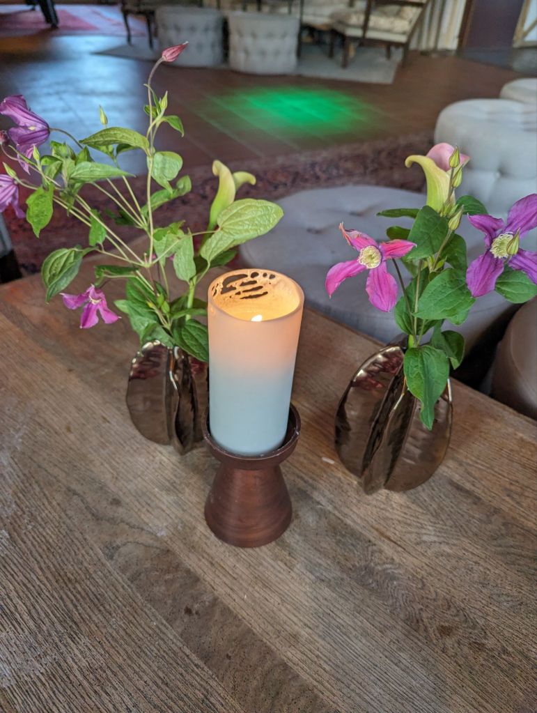 Överallt står fina blommor och tända ljus, personalen är supertrevliga och så bra musik.