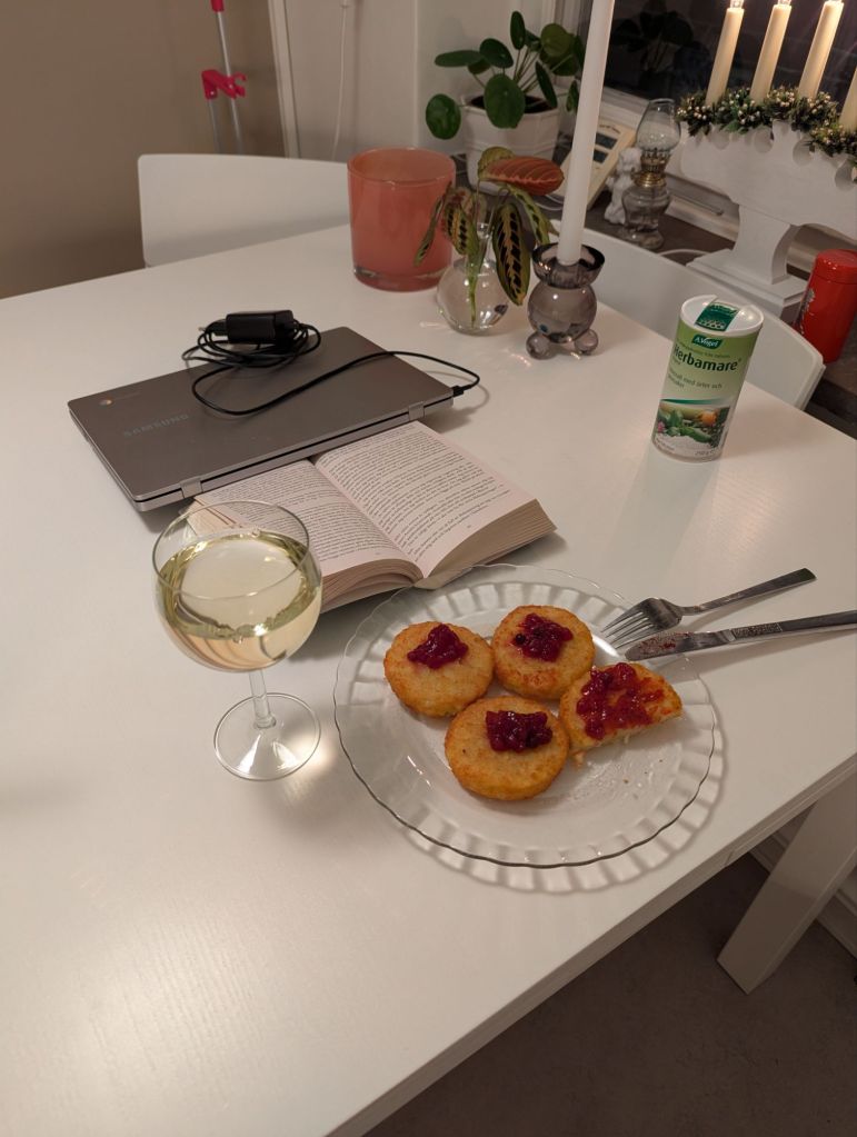 Stekte potatisbullar i ugnen och så blev jag sugen på ett glas vin till. Insåg hur knäppt det såg ut, så jag fnissade och skickade en bild till Systeryster.