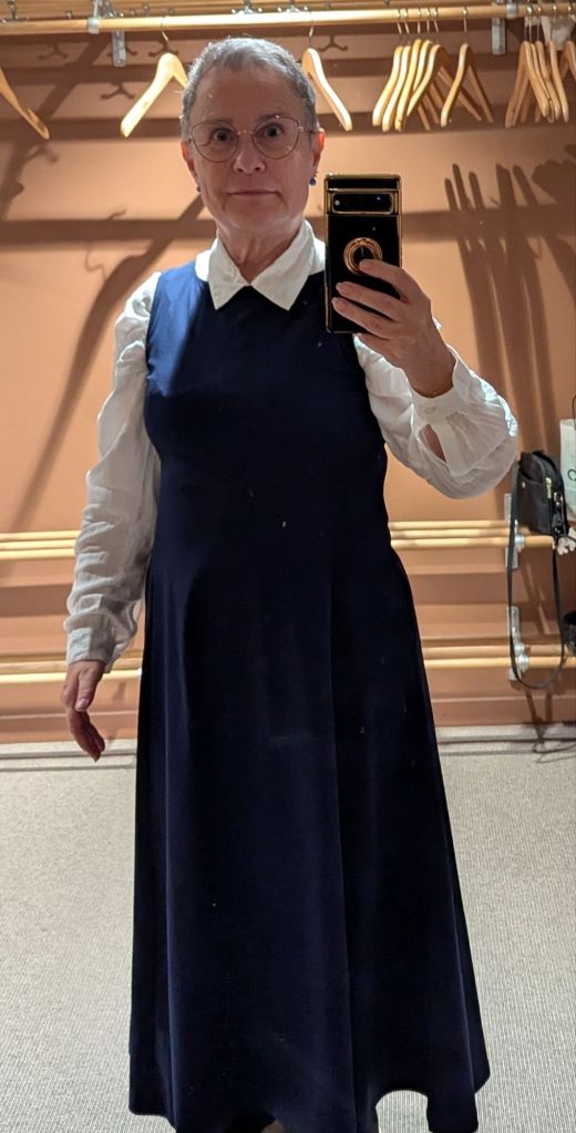 Igår ville jag ha på mig min blå, långa klänning. Den är ärmlös, så jag ville ha min ljusblå polo under. Men den var visst i smutsen. Ja ja, en vit skjorta blir ju bra! På med kläderna, en snabb koll i spegeln i sovrummet och det funkar!