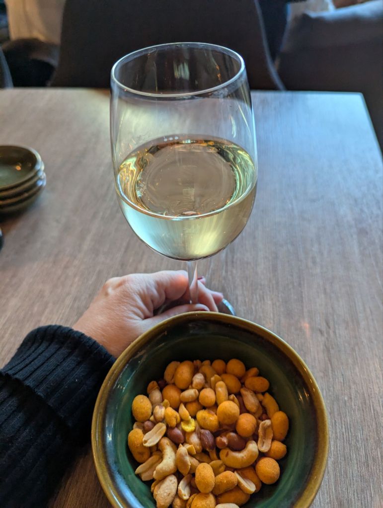 Igår slutade jag 16 på kontoret. Då knatade jag till en av restaurangerna i närheten. Beställde ett glas vin och fick en skål med nötter till.