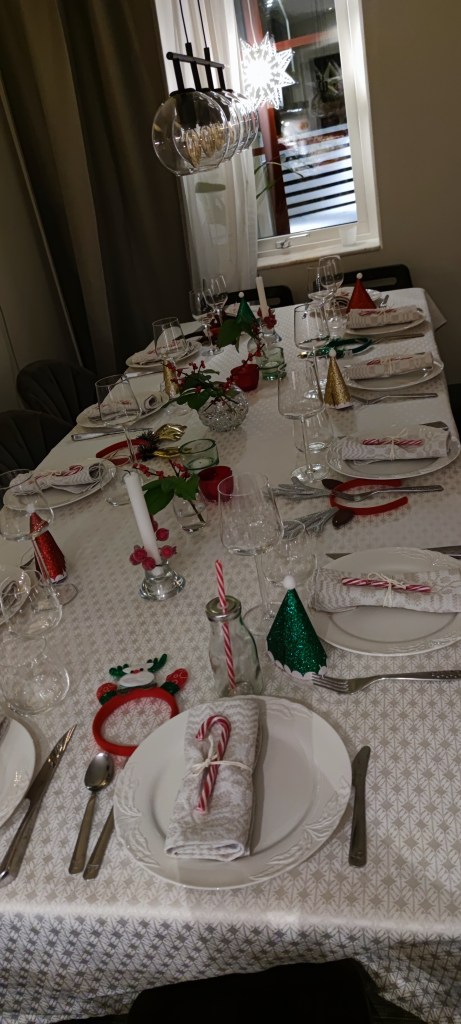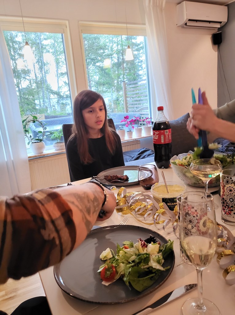 Nettis och Marja fixade god sallad, med rostade pinjenötter, en supersmarrig dressing, citronpotatis i ugn och så grillade Toyboy kycklingfiléer. Och så dukade vi långbord och Bäbis dekorerade fint med serpentiner.