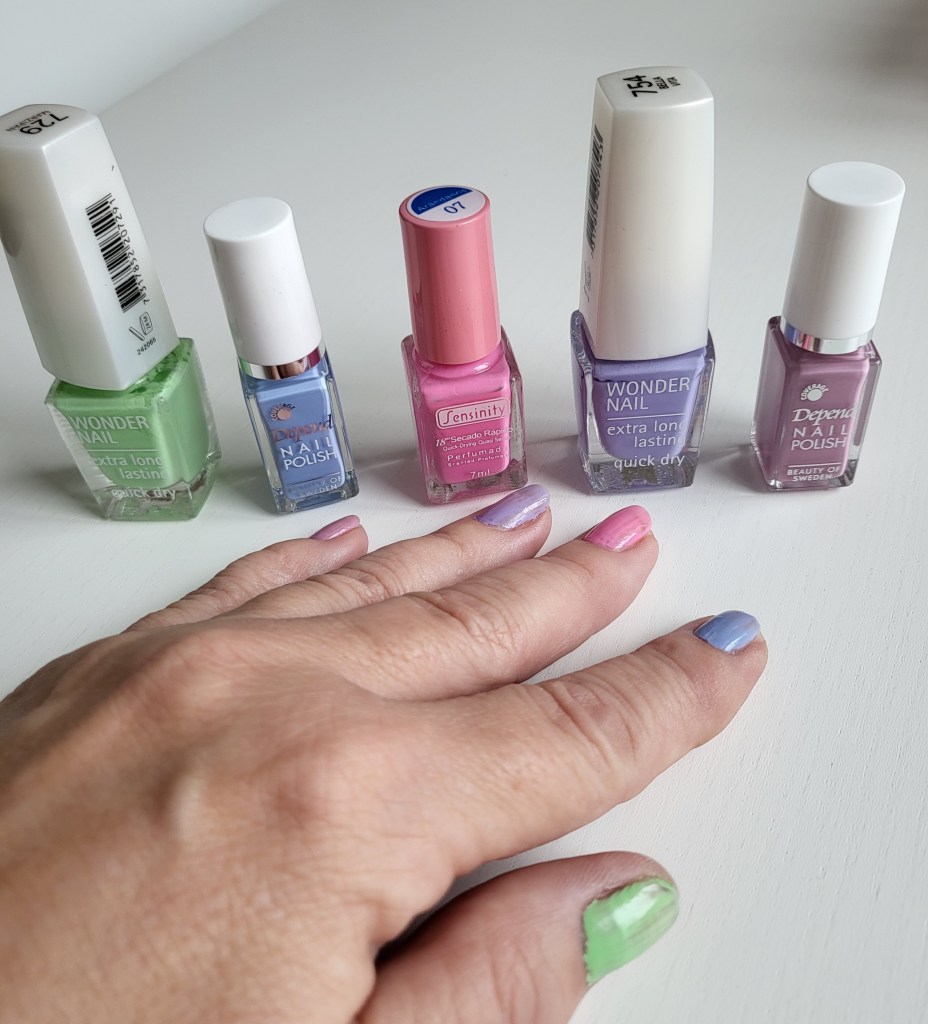Jag är nu ett vandrande påskris. Jag försökte med detta mana fram lite vår. Men snön yrde utanför fönstret under tiden jag målade på nagellacket…