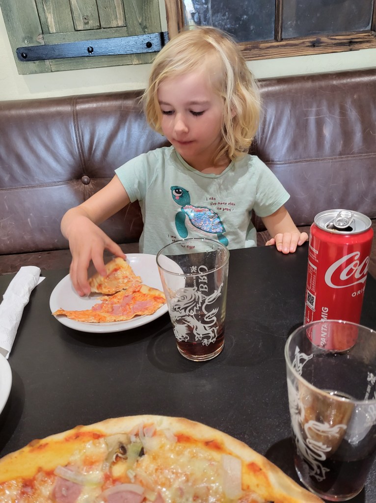 Korven önskade äta pizza, så vi knatade i regnet till centrum och åt.