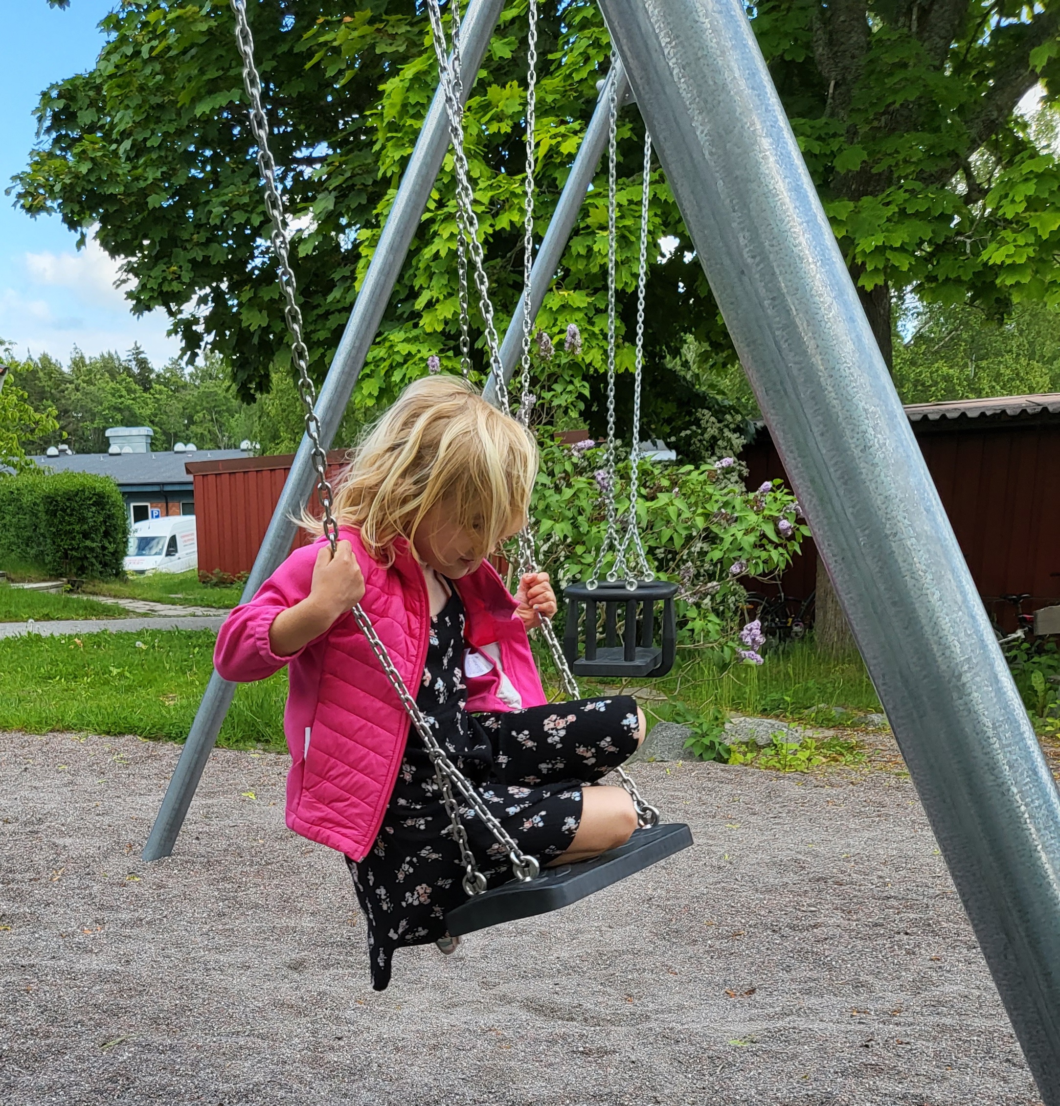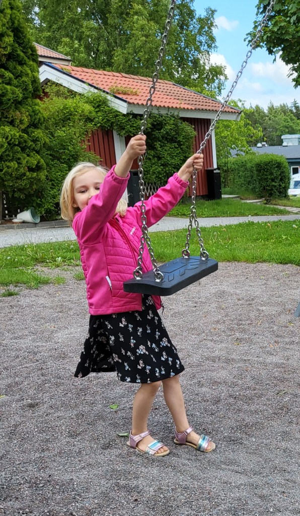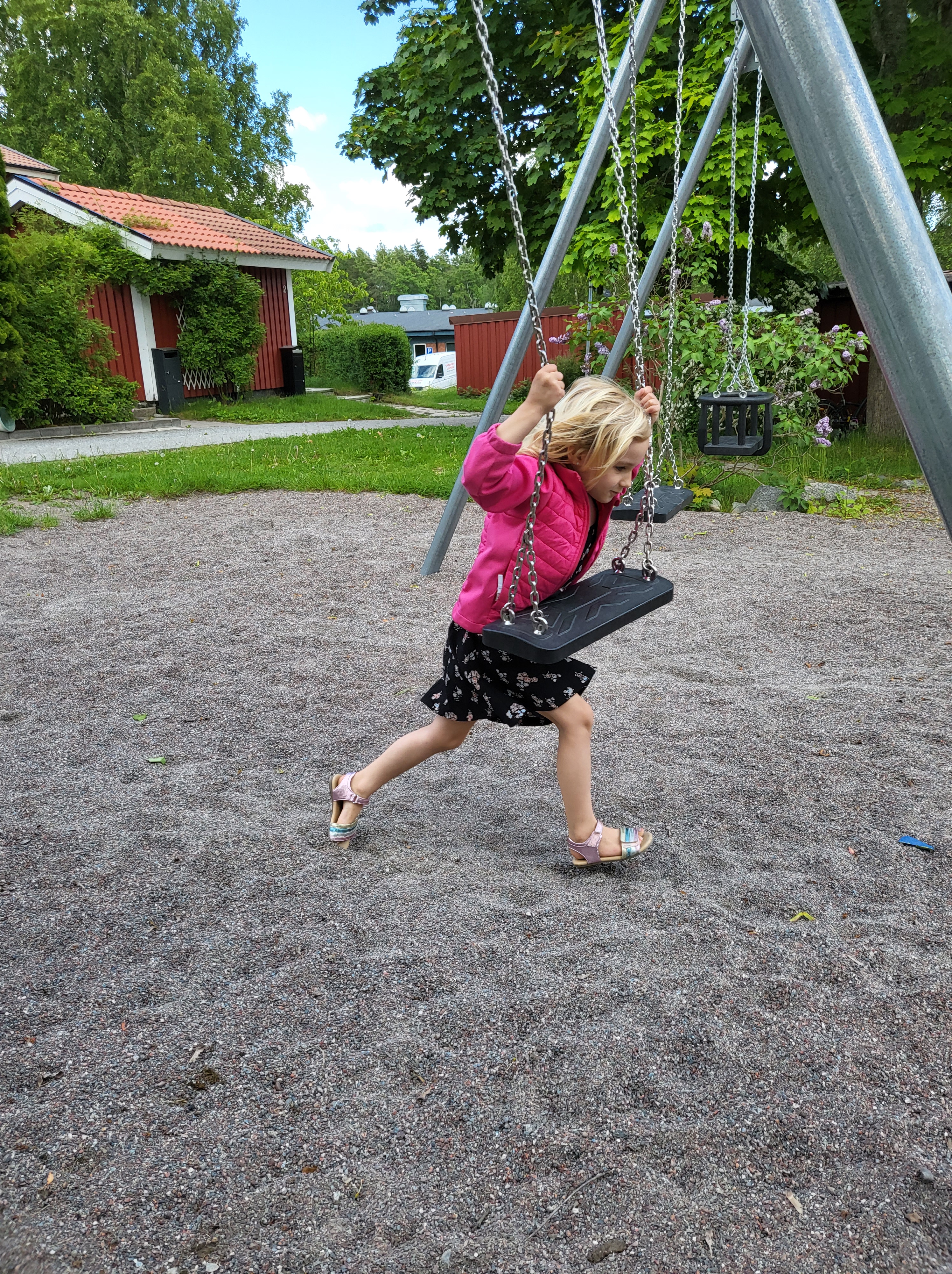 Hon älskar ju att gunga, och sen hoppa av i farten och se hur långt hon kommer.