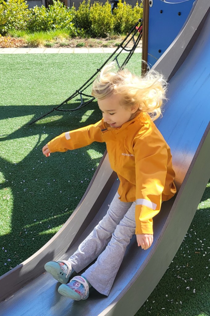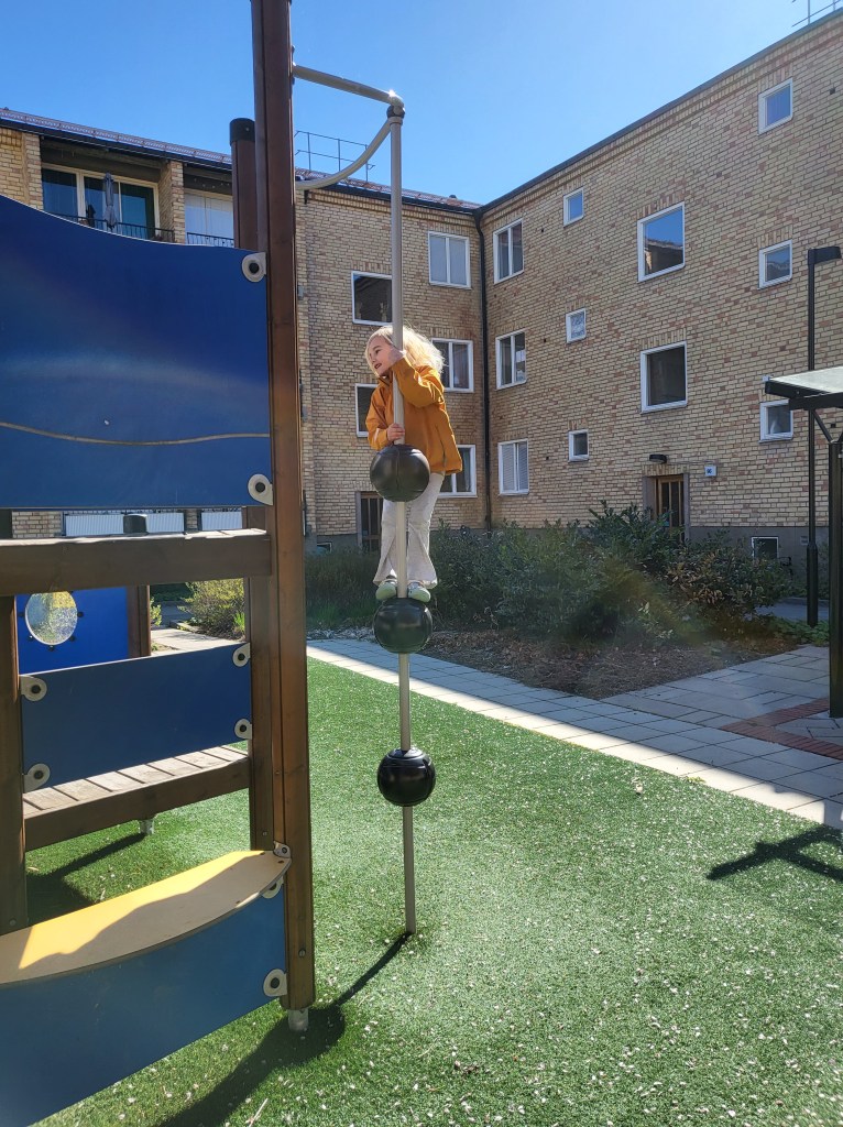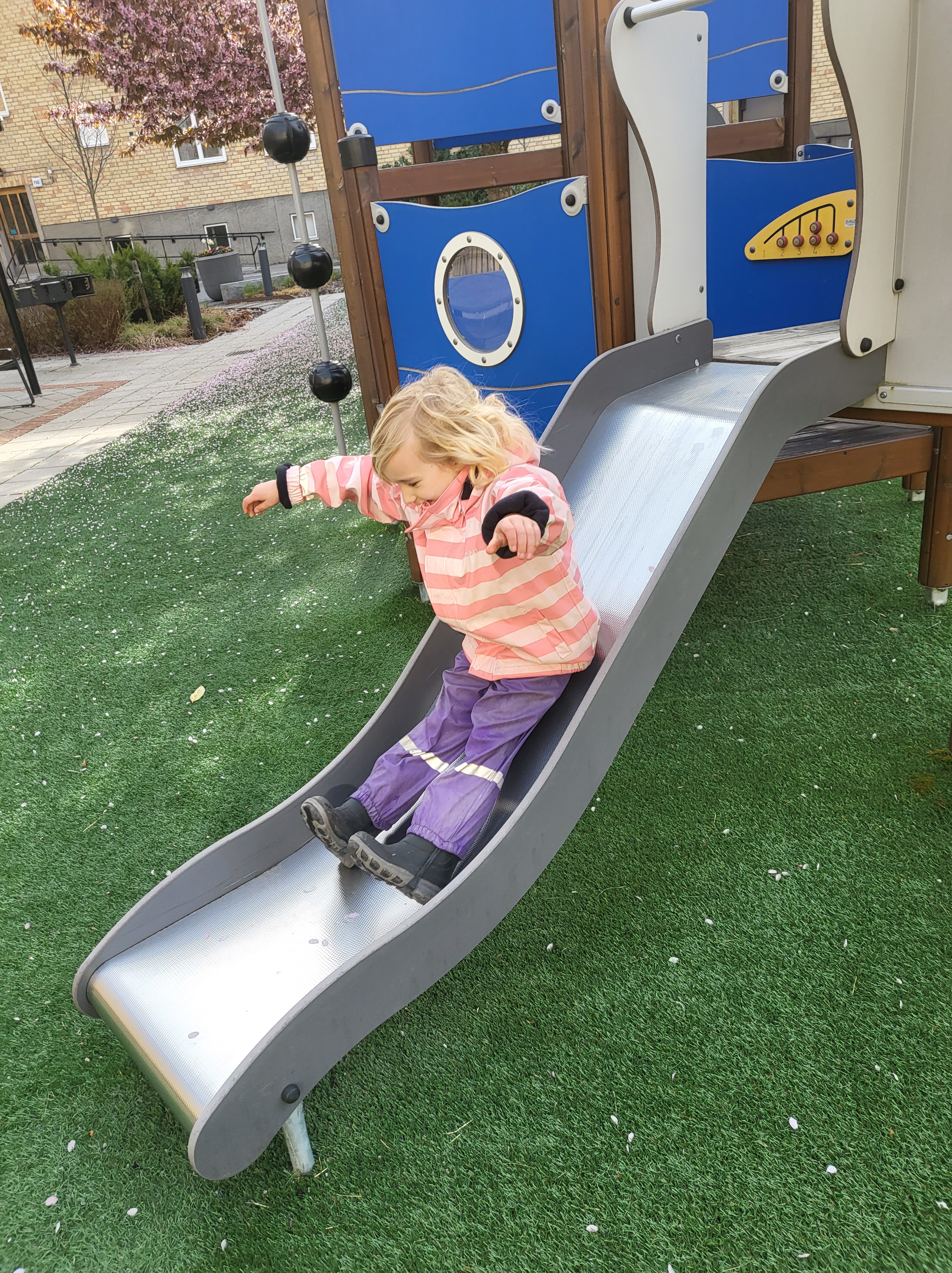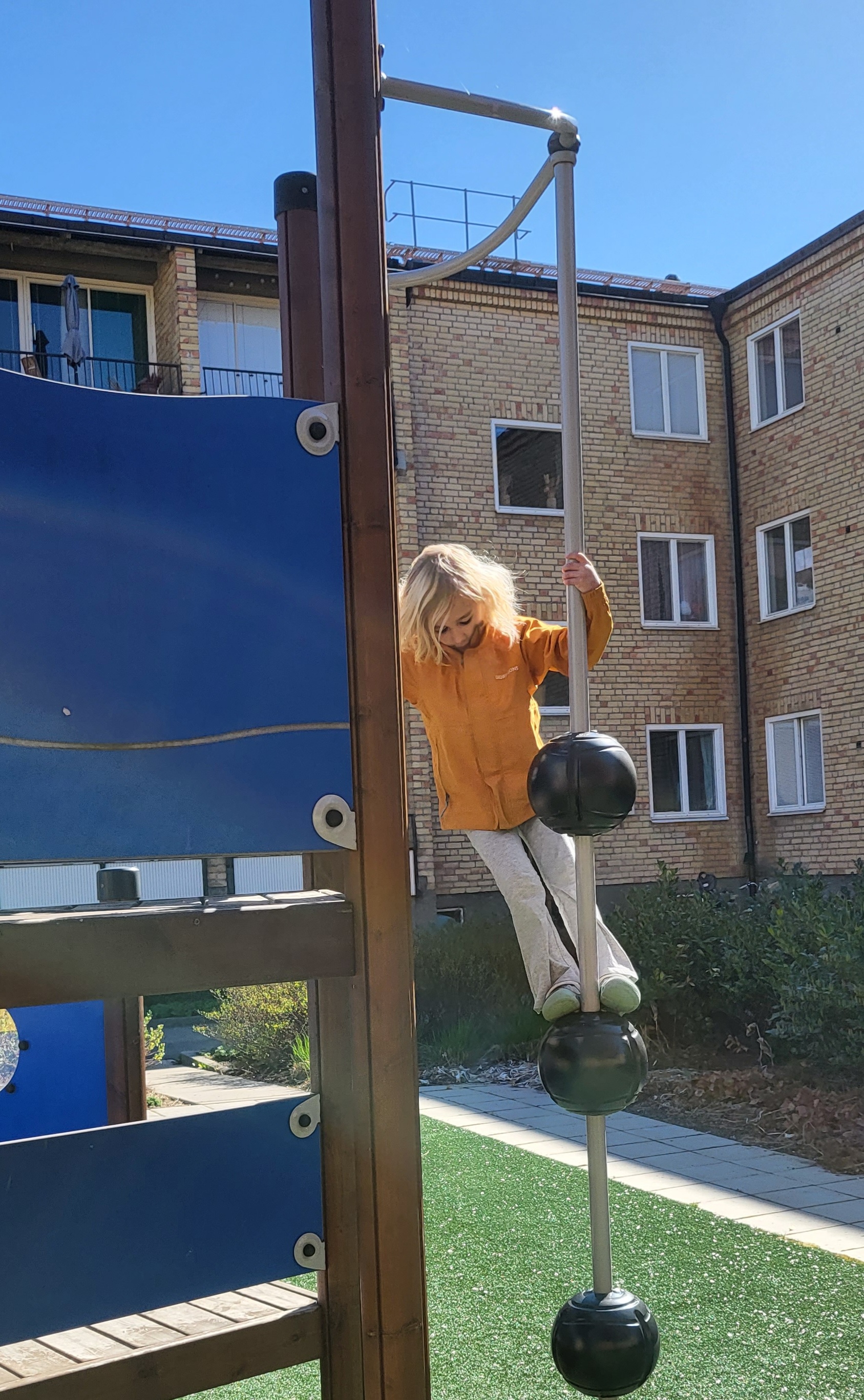 Hon älskar ju att gunga, och sen hoppa av i farten och se hur långt hon kommer.