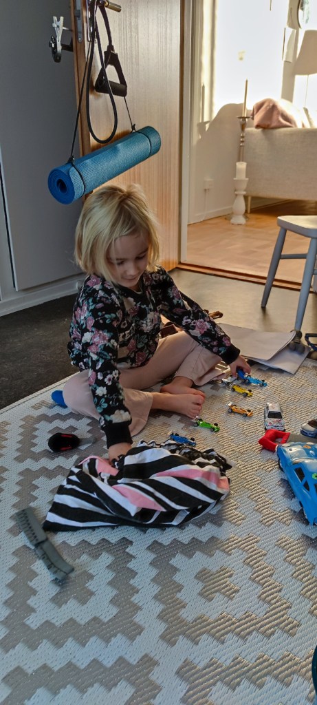 Korven stegade direkt in och tog fram leksakerna som hon sysselsatte sig med hela dagen sen. När Nettis och jag började kolla på dokumentärer på TV på kvällen så fick hon Nettis mobil och så kollade hon på barnprogram.