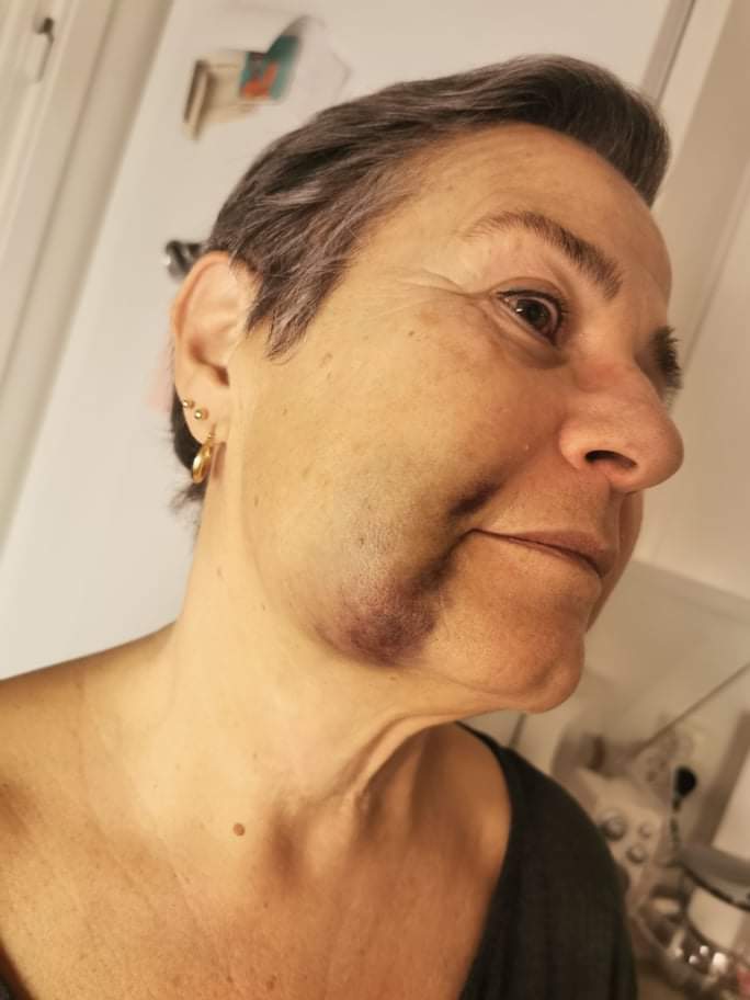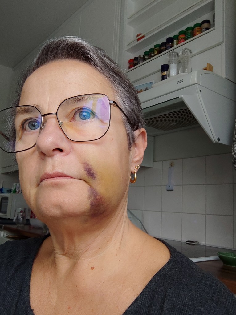 Gult på nederdelen av kinden och så mörklila till det! Så vackert! Även under ögat är det en liten mörkröd ton. Så chict!