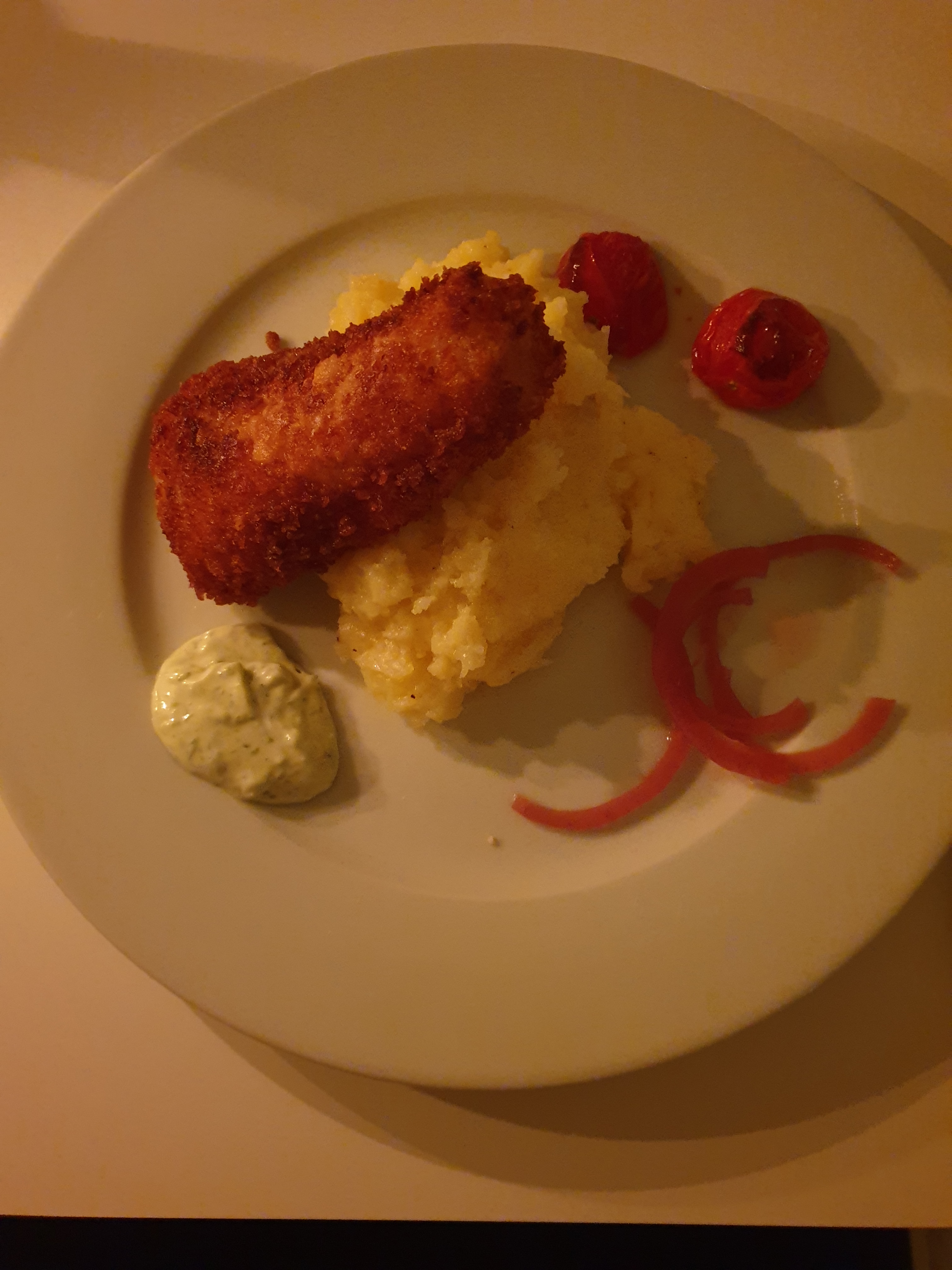 Jag hängde med hem till dem sen. Svågerna lagade så god panerad fisk, med parmesanmos till.