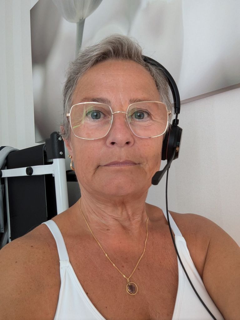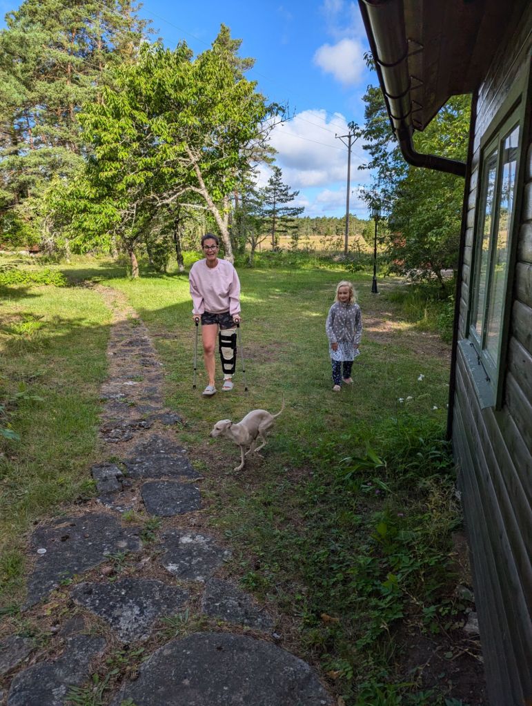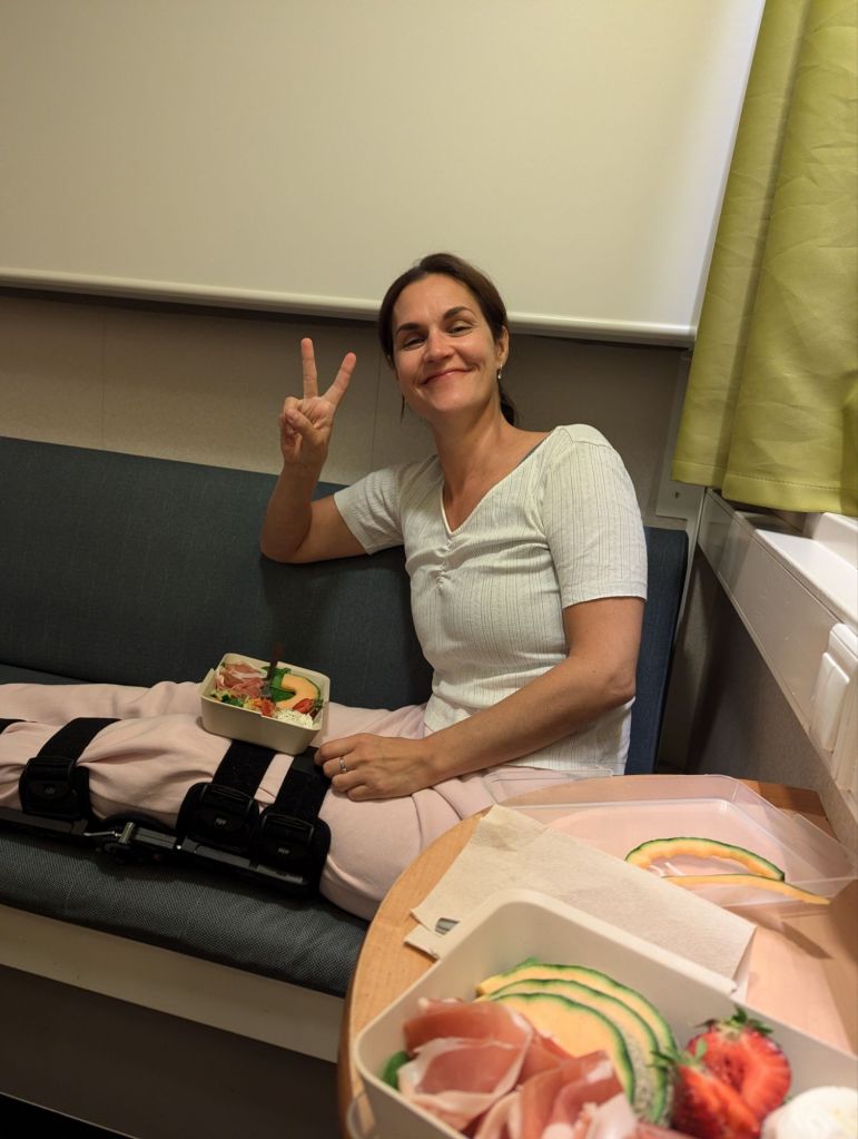 Nettis frågade om det möjligen fanns en djurhytt ledig och vi hade tur, en enda fanns det vi kunde få! Så då kunde Nettis sitta med benet uppe. Jag fick och köpte mat till oss och så satt vi och åt och babblade.